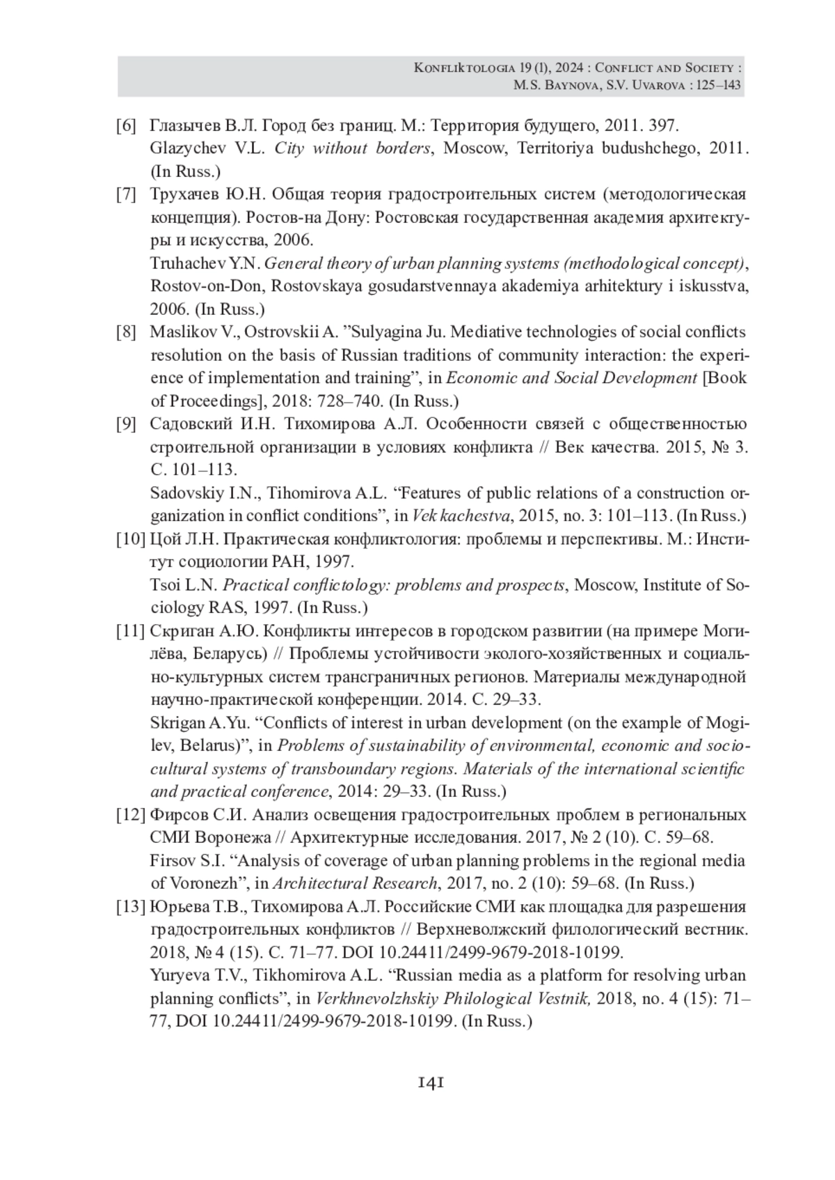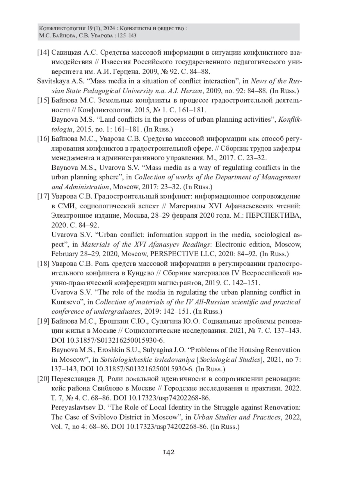 УВАРОВА С. В., БАЙНОВА М. С. ВЛИЯНИЕ СРЕДСТВ МАССОВОЙ ИНФОРМАЦИИ НА ГРАДОСТРОИТЕЛЬНЫЕ КОНФЛИКТЫ В МОСКВЕ // КОНФЛИКТОЛОГИЯ. 2024. Т. 19 № 1