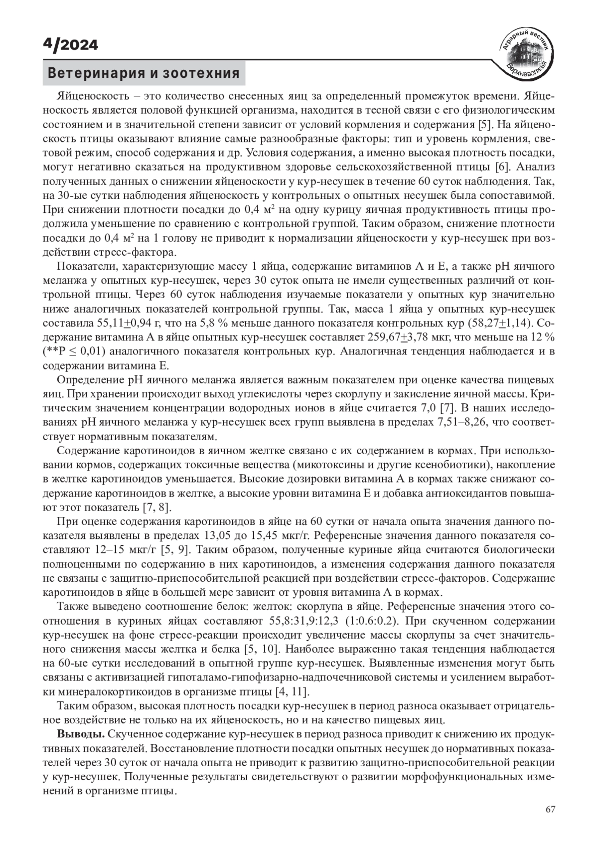 ч 1. Бушкарева А.С. Влияние плотности посадки на сохранность и продуктивность кур-несушек промышленного стада // Вестник АПК Верхневолжья. 2017. № 1(37). С. 29-32. EDN: YPRVBV