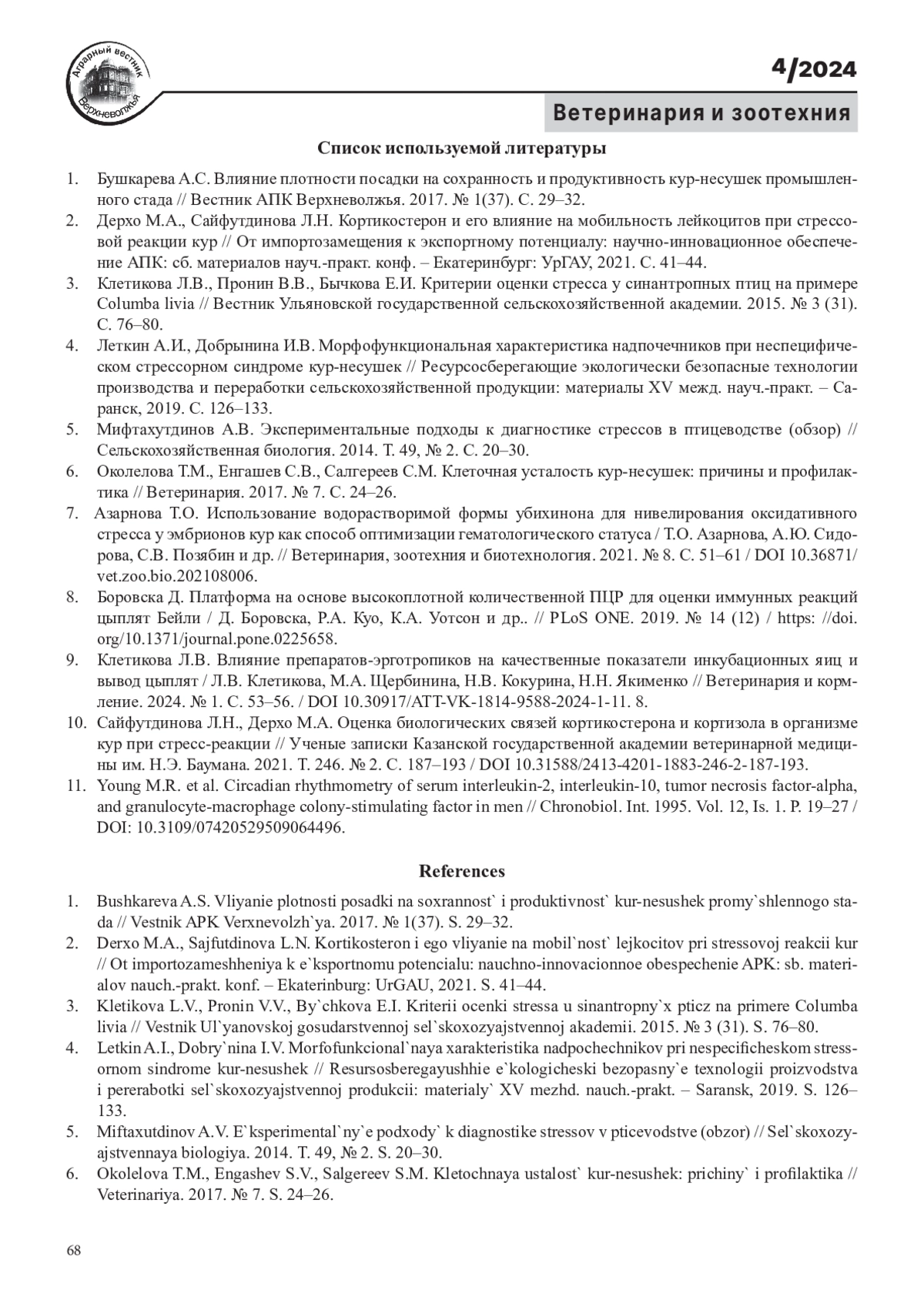 10. Сайфутдинова Л.Н., Дерхо М.А. Оценка биологических связей кортикостерона и кортизола в организме кур при стресс-реакции // Ученые записки Казанской государственной академии ветеринарной медицины им. Н.Э. Баумана. 2021. Т. 246. № 2. С. 187-193 /DOI. DOI: 10.31588/2413-4201-1883-246-2-187-193 EDN: RMJDMC