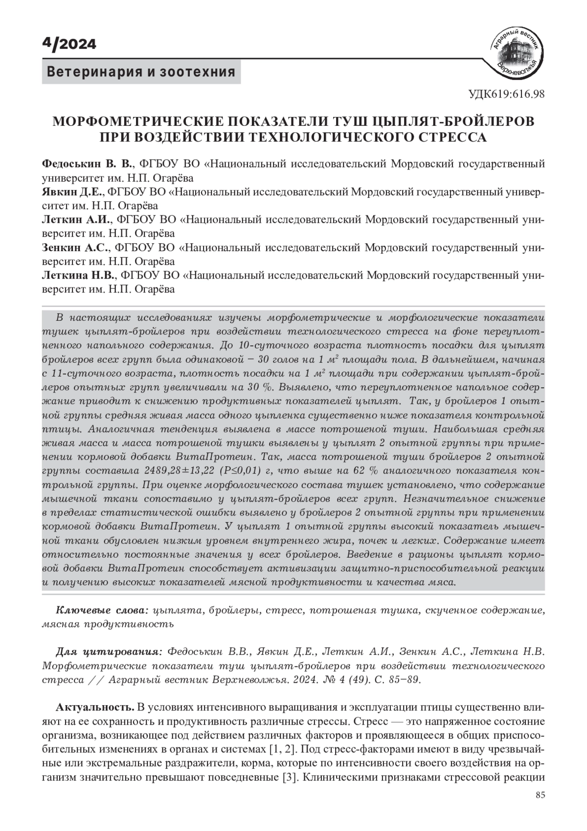 ФЕДОСЬКИН В.В., ЯВКИН Д. Е., ЛЕТКИН А. И., ЗЕНКИН А. С., ЛЕТКИНА Н. В. МОРФОМЕТРИЧЕСКИЕ ПОКАЗАТЕЛИ ТУШ ЦЫПЛЯТ-БРОЙЛЕРОВ ПРИ ВОЗДЕЙСТВИИ ТЕХНОЛОГИЧЕСКОГО СТРЕССА // АГРАРНЫЙ ВЕСТНИК ВЕРХНЕВОЛЖЬЯ. 2024. № 4 (49)