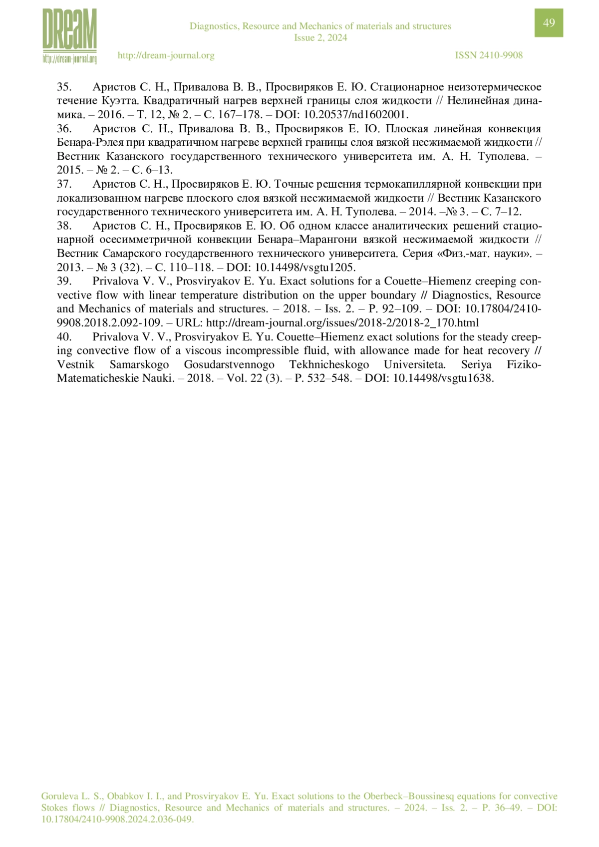 29. Горулева Л. С., Просвиряков Е. Ю. Новый класс точных решений уравнений магнит-ной гидродинамики для описания конвективных течений бинарных жидкостей // Химическая физика и мезоскопия. – 2023. – Т. 25, № 4. – С. 447–462. – DOI: 10.15350/17270529.2023.4.39.