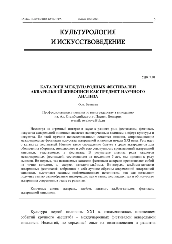 Несмотря на огромный интерес в науке к разного рода фестивалям, фестиваль искусства акварельной живописи является малоизученным явлением в сфере культуры и искусства. По этой причине неисследованными остаются издания, сопровождающие международные фестивали искусства акварельной живописи начала ХХI века. Речь идет о каталогах фестивалей. Именно такое определение бытует в среде акварелистов для обозначения сборника, вмещающего в себя всю совокупность произведений акварельной живописи, участвующих в фестивале. В результате анализа ряда каталогов международных фестивалей, состоявшихся за последние 5 лет, мы пришли к ряду выводов. Во-первых, так называемые каталоги фестиваля акварели представляют собой не точно каталоги, а, скорее, каталоги-альбомы. Во-вторых, альбомы-каталоги акварельных фестивалей, вобравшие в себя лучшие образцы современной акварельной живописи, выступают важным информационным источником, так как позволяют получить самую разнообразную информацию как о самих фестивалях, так и об искусстве акварели на современном этапе ее развития.