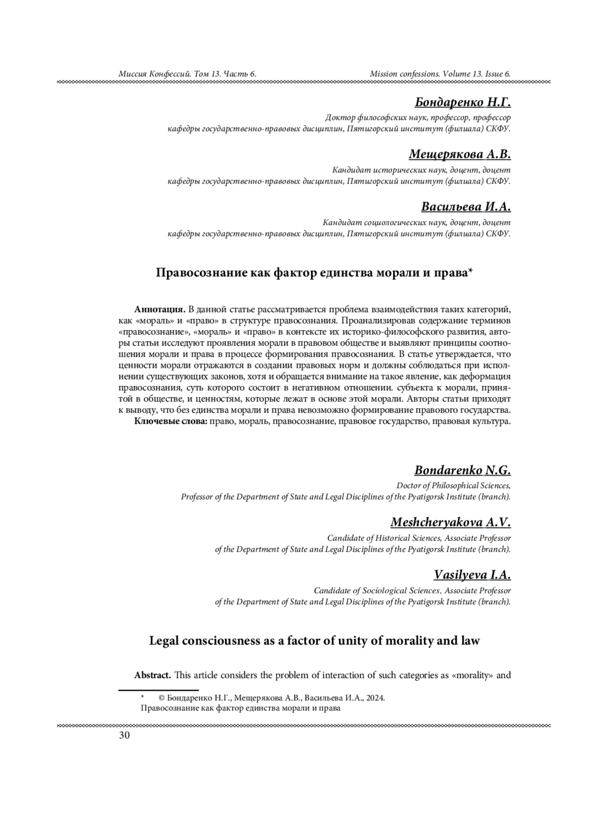 В данной статье рассматривается проблема взаимодействия таких категорий, как «мораль» и «право» в структуре правосознания. Проанализировав содержание терминов «правосознание», «мораль» и «право» в контексте их историко-философского развития, авторы статьи исследуют проявления морали в правовом обществе и выявляют принципы соотношения морали и права в процессе формирования правосознания. В статье утверждается, что ценности морали отражаются в создании правовых норм и должны соблюдаться при исполнении существующих законов, хотя и обращается внимание на такое явление, как деформация правосознания, суть которого состоит в негативном отношении. субъекта к морали, принятой в обществе, и ценностям, которые лежат в основе этой морали. Авторы статьи приходят к выводу, что без единства морали и права невозможно формирование правового государства.