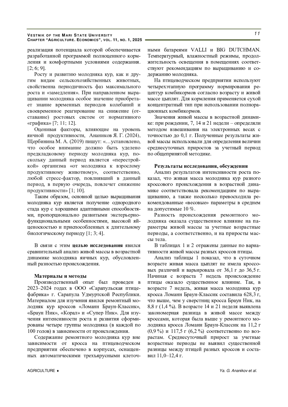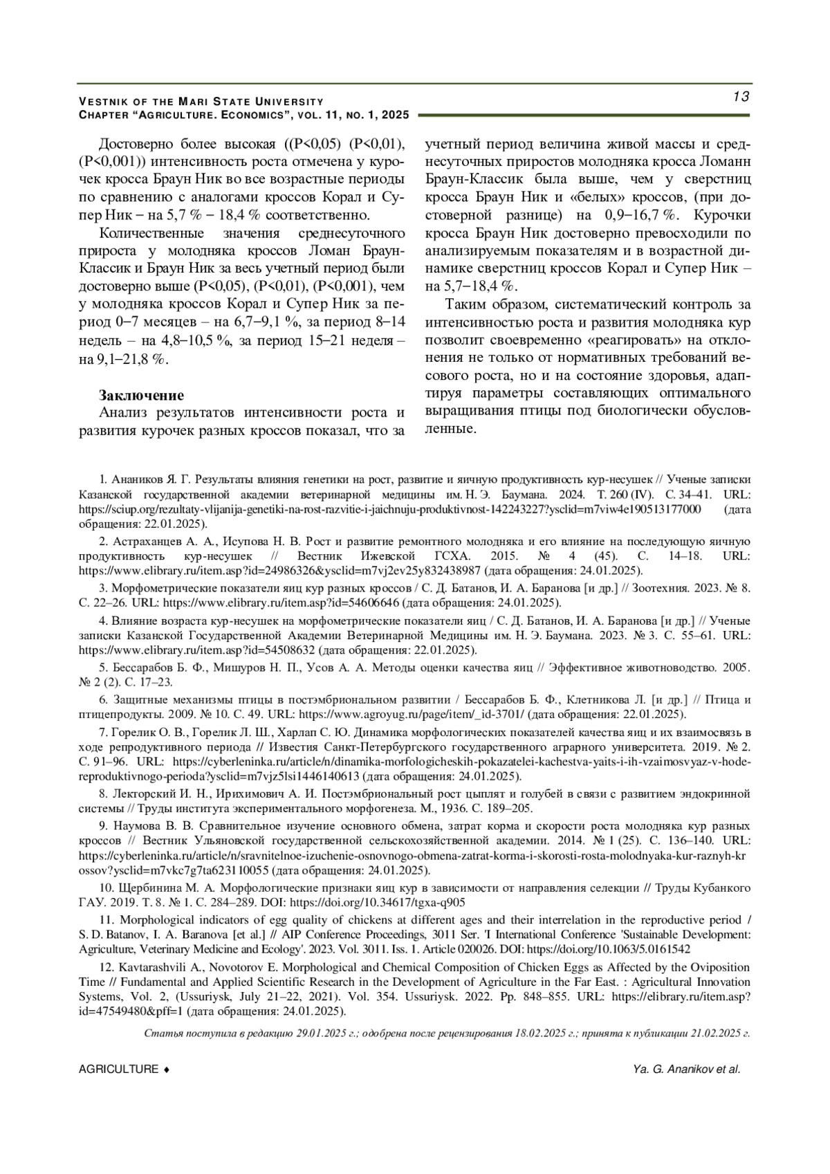 2. Астраханцев А. А., Исупова Н. В. Рост и развитие ремонтного молодняка и его влияние на последующую яичную продуктивность кур-несушек // Вестник Ижевской ГСХА. 2015. № 4 (45). С. 14-18. URL: https://www.elibrary.ru/item.asp?id=24986326&ysclid=m7vj2ev25y832438987 (дата обращения: 24.01.2025).
