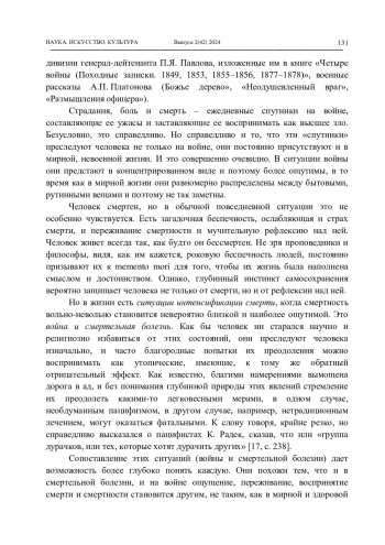 В статье проводится сравнительный анализ двух пограничных ситуаций, в которых происходит интенсификация смерти: это война и терминальная болезнь.