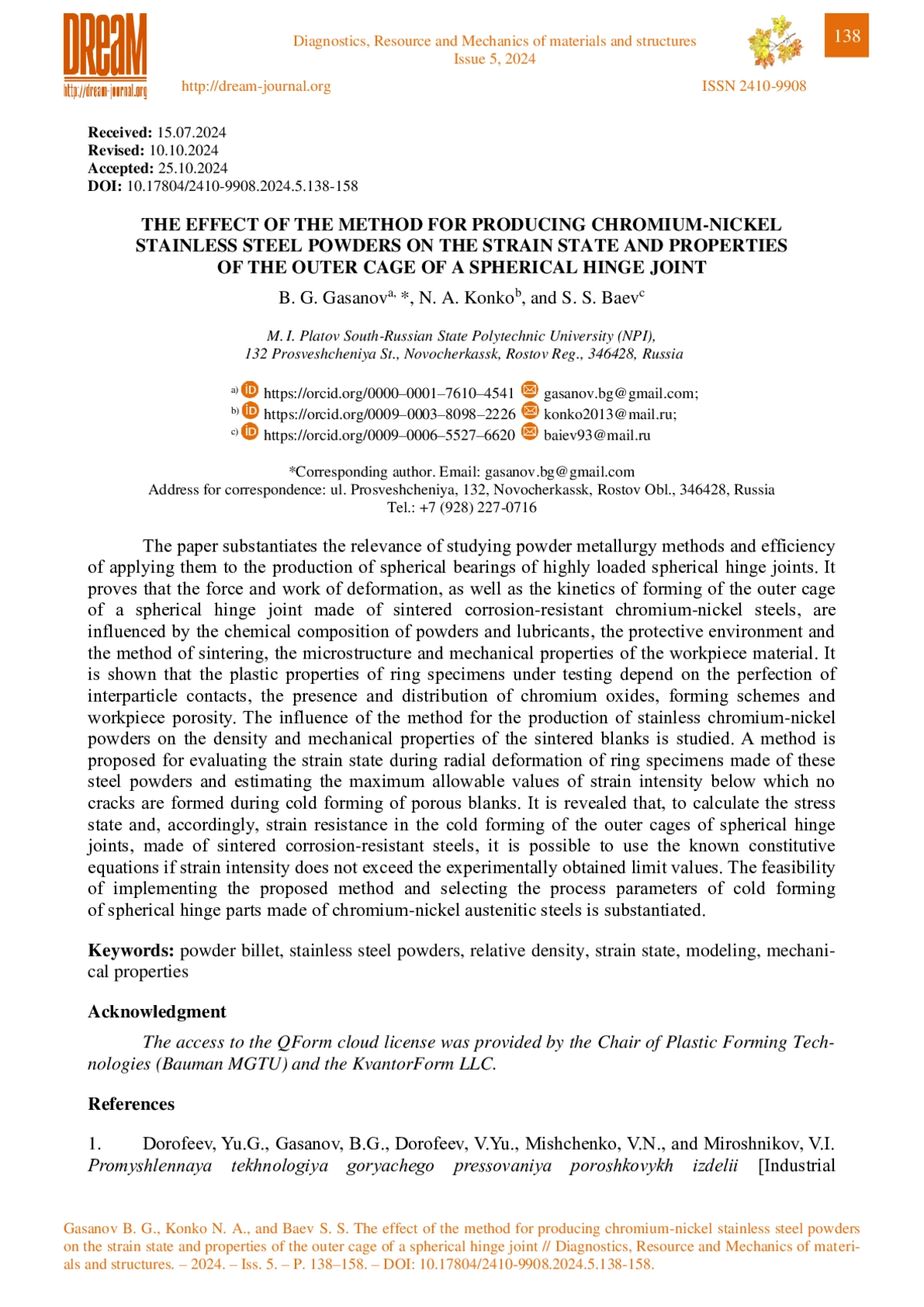 2. Kuhn H. A., Downey C. L. Material behavior in powder preform forging // Journal of Engineering Materials and Technology. – 1973. – Vol. 95, iss. 1. – P. 41–46. – DOI: 10.1115/1.3443104.