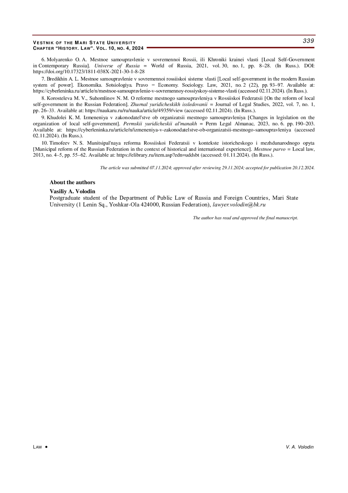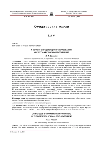 ВОЛОДИН В. А. К ВОПРОСУ О ПРЕДСТОЯЩИХ ПРЕОБРАЗОВАНИЯХ ИНСТИТУТА МЕСТНОГО САМОУПРАВЛЕНИЯ // ВЕСТНИК МАРИЙСКОГО ГОСУДАРСТВЕННОГО УНИВЕРСИТЕТА. СЕРИЯ: ИСТОРИЧЕСКИЕ НАУКИ. ЮРИДИЧЕСКИЕ НАУКИ. 2024. Т. 10 № 4 (40)