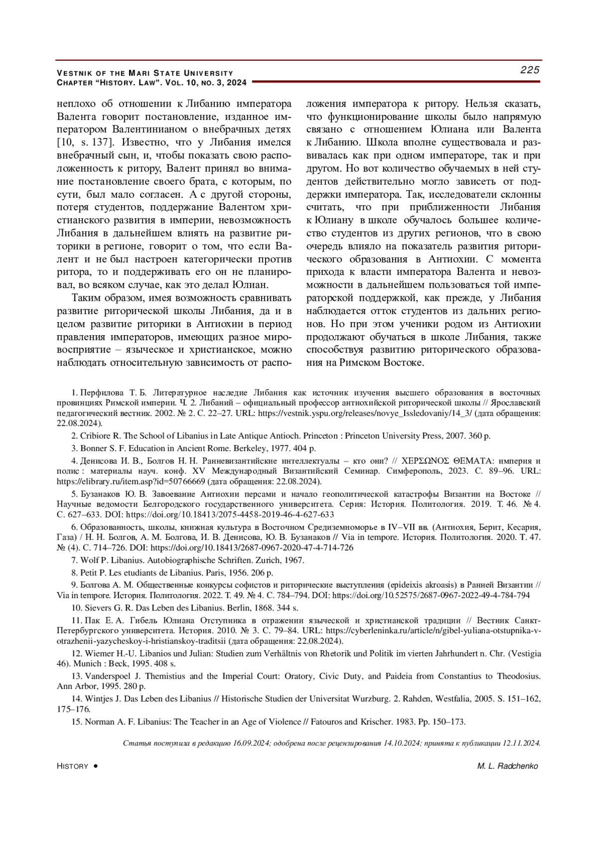 1. Перфилова Т. Б. Литературное наследие Либания как источник изучения высшего образования в восточных провинциях Римской империи. Ч. 2. Либаний - официальный профессор антиохийской риторической школы // Ярославский педагогический вестник. 2002. № 2. С. 22-27. URL: https://vestnik.yspu.org/releases/novye_Issledovaniy/14_3/(дата обращения: 22.08.2024).