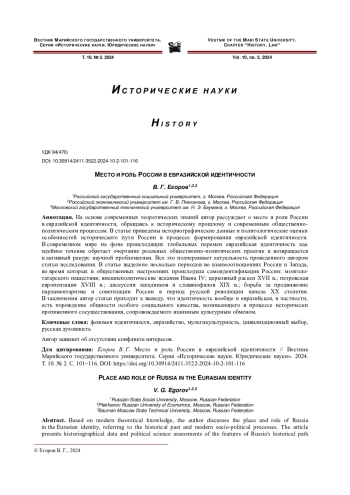 ЕГОРОВ В. Г. МЕСТО И РОЛЬ РОССИИ В ЕВРАЗИЙСКОЙ ИДЕНТИЧНОСТИ // ВЕСТНИК МАРИЙСКОГО ГОСУДАРСТВЕННОГО УНИВЕРСИТЕТА. СЕРИЯ: ИСТОРИЧЕСКИЕ НАУКИ. ЮРИДИЧЕСКИЕ НАУКИ. 2024. Т. 10 № 2 (38)