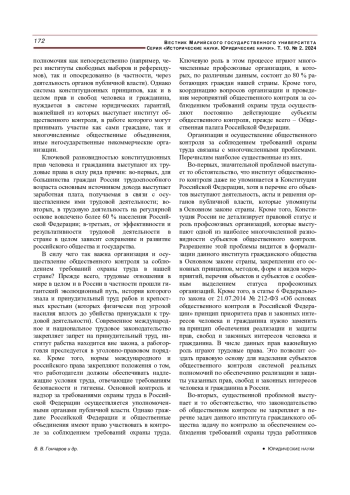 Вопросы организации и осуществления общественного контроля за соблюдением законодательства о труде как в Российской Федерации, так и за рубежом широко исследуются в работах Ш. Ю. Абитовой [1, с. 167‒173], И. А. Беловой [2, с. 114‒124], Ж. В. Король [3, с. 636‒640], А. Ю. Топорова [4, с. 123‒127], Е. П. Циндяйкиной [5, с. 257‒261] и многих других авторов. Важное значение в анализе механизма обеспечения трудовых прав как граждан России, так и мигрантов имеют и посвященные изучению процессов взаимодействия субъектов общественного контроля с органами публичной власти в данной сфере работы таких, например, авторов, как, М. А. Паршина [6, с. 69‒70], Л. А. Спектор [7, с. 194‒196] и ряда иных. Однако доля научных работ, затрагивающих проблематику организации и проведения мероприятий общественного контроля за соблюдением требований охраны труда, представляется незначительной, чем и обусловлен выбор темы настоящего научного исследования, целью которого является не только формализация и анализ основных проблем, препятствующих повышению роли и значимости института общественного контроля в системе мер по обеспечению требований охраны труда в Российской Федерации, но и разработка, а также обоснование системы мероприятий по разрешению указанных проблем.