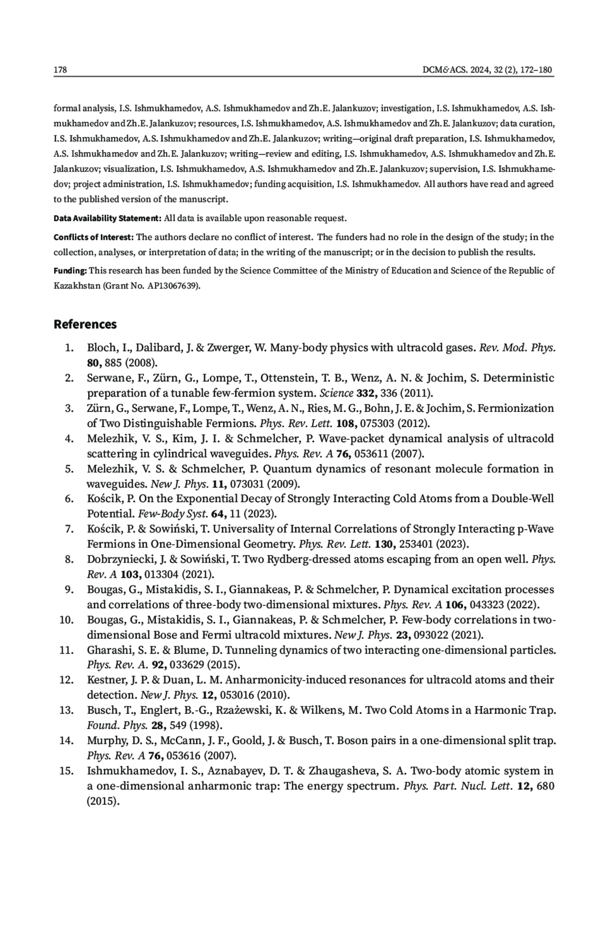 15. Ishmukhamedov, I. S., Aznabayev, D. T. & Zhaugasheva, S. A. Two-body atomic system in a one-dimensional anharmonic trap: The energy spectrum. Phys. Part. Nucl. Lett. 12, 680 (2015).