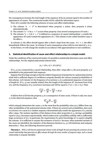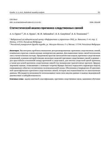 The problem of identifying deterministic cause-and-effect relationships, initially hidden in accumulated empirical data, is discussed. Statistical methods were used to identify such relationships. A simple mathematical model of cause-and-effect relationships is proposed, in the framework of which several models of causal dependencies in data are described – for the simplest relationship between cause and effect, for many effects of one cause, as well as for chains of cause-and-effect relationships (so-called transitive causes). Estimates are formulated that allow using the de Moivre–Laplace theorem to determine the parameters of causal dependencies linking events in a polynomial scheme trials. The statements about the unambiguous identification of causeandeffect dependencies that are reconstructed from accumulated data are proved. The possibilities of using such data analysis schemes in medical diagnostics and cybersecurity tasks are discussed.