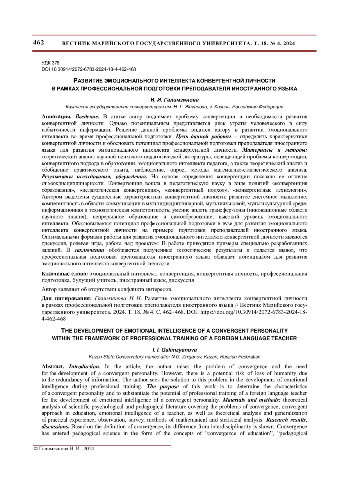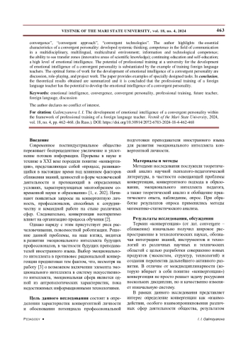 Введение. В статье автор поднимает проблему конвергенции и необходимости развития конвергентной личности. Однако потенциальным представляется риск утраты человеческого в силу избыточности информации. Решение данной проблемы видится автору в развитии эмоционального интеллекта во время профессиональной подготовки. Цель данной работы - определить характеристики конвергентной личности и обосновать потенциал профессиональной подготовки преподавателя иностранного языка для развития эмоционального интеллекта конвергентной личности.