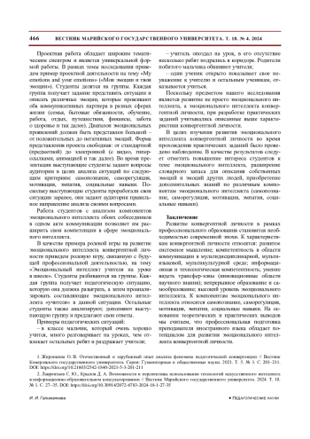 Однако наряду с этим присутствует риск расчеловечивания, повсеместной роботизации. Решение данной проблемы, на наш взгляд, видится в развитии эмоционального интеллекта будущих профессионалов, в частности будущих преподавателей иностранного языка. Выбор эмоционального интеллекта в противовес рациональной конвергенции продиктован тем фактом, что, несмотря на работу [3] о возможном включении элемента эмоционального интеллекта в систему искусственного интеллекта, эмоциональная сфера является одной из антропологических характеристик, пока недостижимых информационными технологиями.
