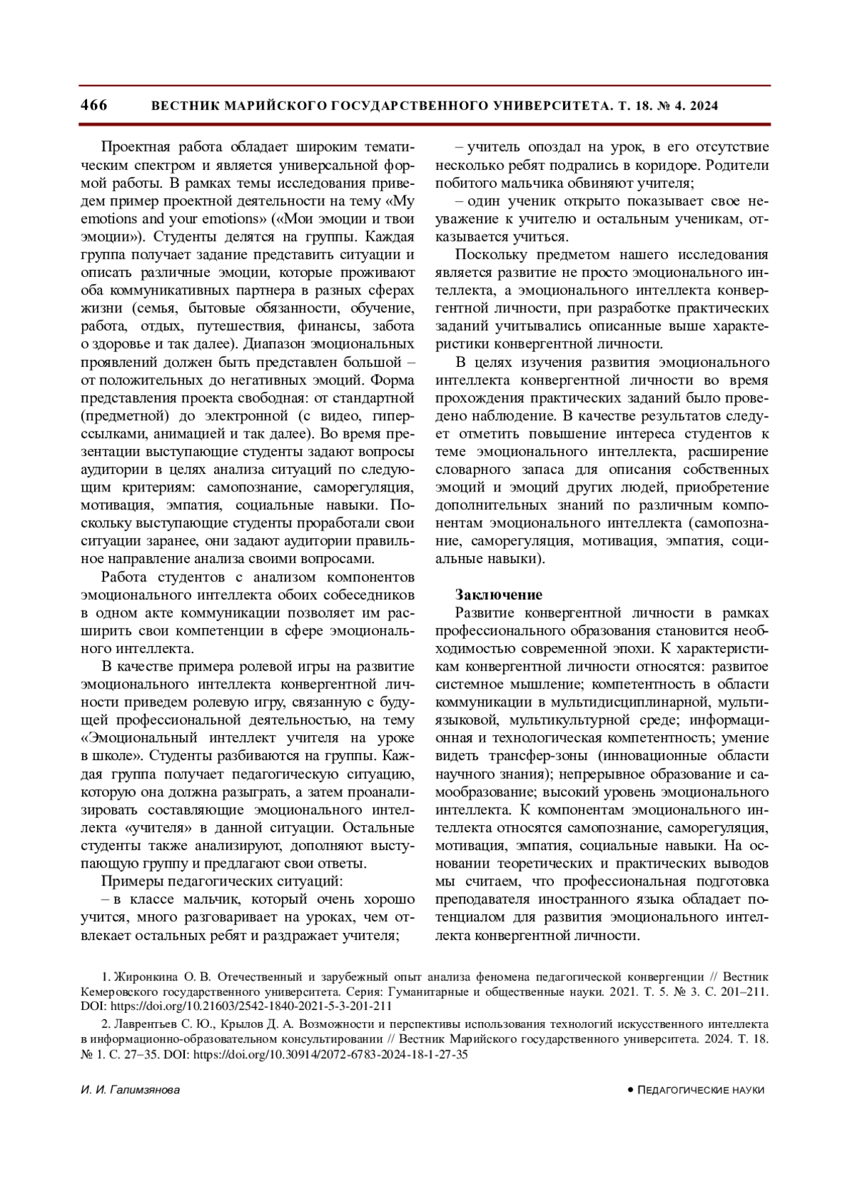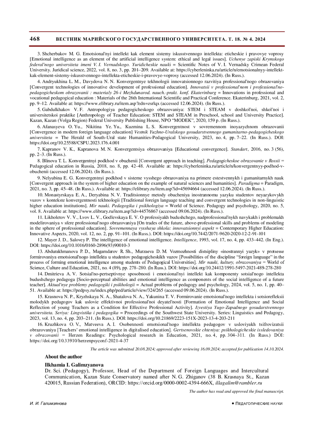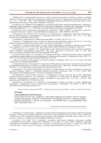 6. Афанасьева О. Ю., Никитина Е. Ю., Кузьмина Л. С. Конвергентность в современном иноязычном образовании // Вестник Южно-Уральского государственного гуманитарно-педагогического университета. 2023. № 4. С. 7-22. DOI: 10.25588/CSPU.2023.176.4.001 EDN: CGIDIP