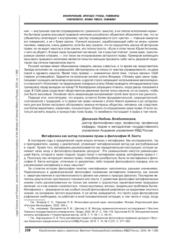 В последние годы в юридической науке возрос интерес к метафизике. Как исследователи, так и преподаватели, наряду с диалектикой, упоминают метафизический метод как востребованный в науке. Кроме того, метафизика рассматривается как парадигмальная конструкция, которая занимает свою нишу в философско-правовом дискурсе. Эти размышления кажутся реминисценцией Канта, который в своих поздних трудах писал о метафизике нравов, метафизике права и т. д. Поскольку нас интересует именно право, попробуем разобраться, была ли метафизика в философии И. Канта методом, отличным от диалектики, либо теорией философского порядка, или он рассматривал метафизику в иных смыслах?