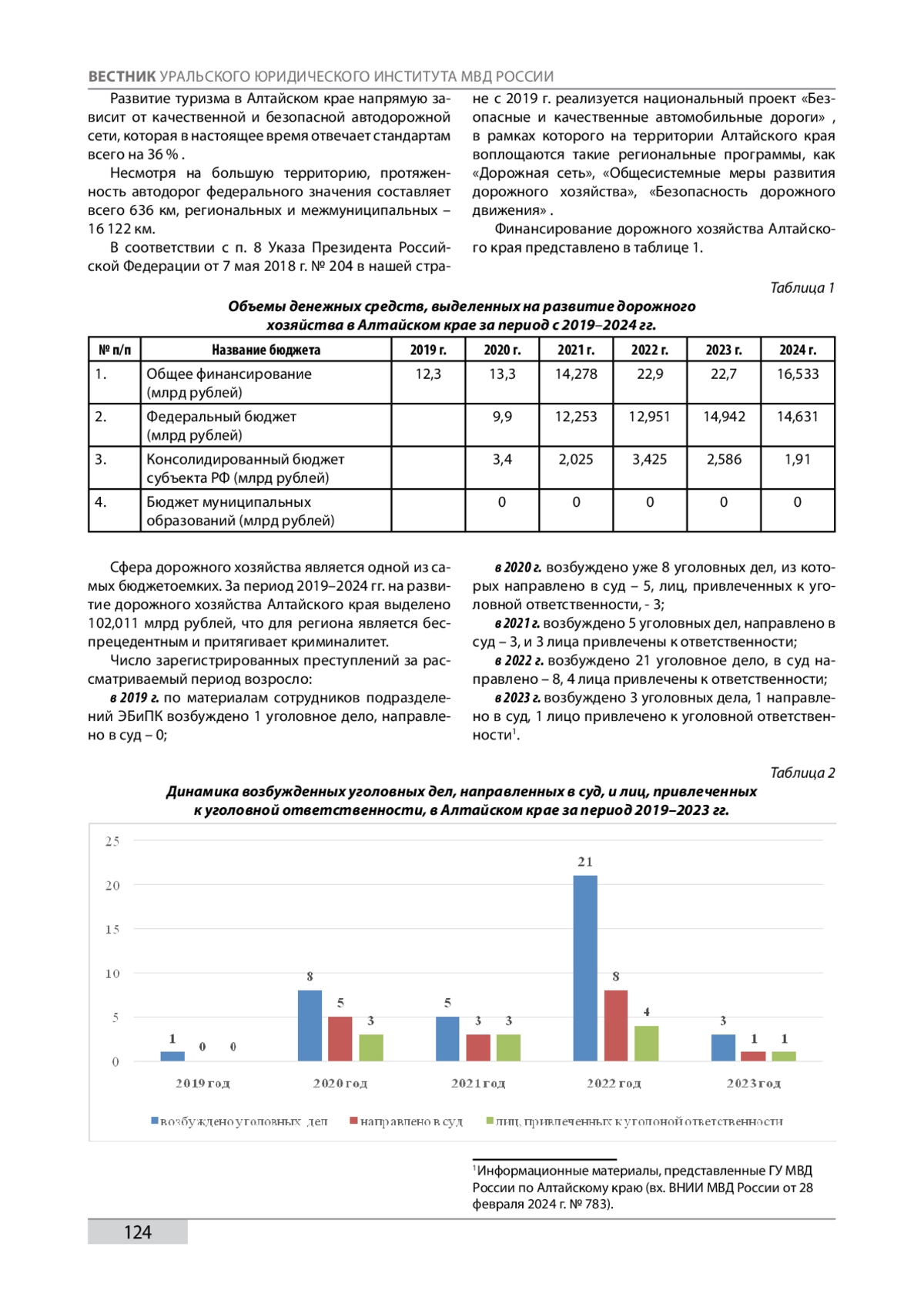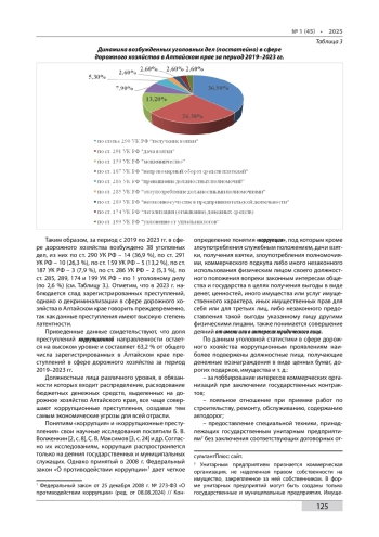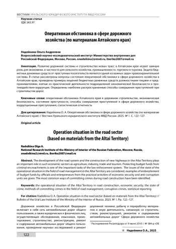 Развитие дорожной системы и строительство новых трасс в Алтайском крае играет важную роль для экономики, в частности для сельского хозяйства, промышленности, торговли и туризма. Защита бюджетных денежных средств от преступных посягательств является одной из важных задач правоохранительной системы. В статье рассмотрены вопросы состояния оперативной обстановки в сфере дорожного хозяйства в Алтайском крае, приведены примеры хищений бюджетных денежных средств должностными лицами и предпринимателями, взятые из практической деятельности подразделений экономической безопасности и противодействия коррупции. Определены наиболее распространенные способы совершения преступлений при строительстве дорог.