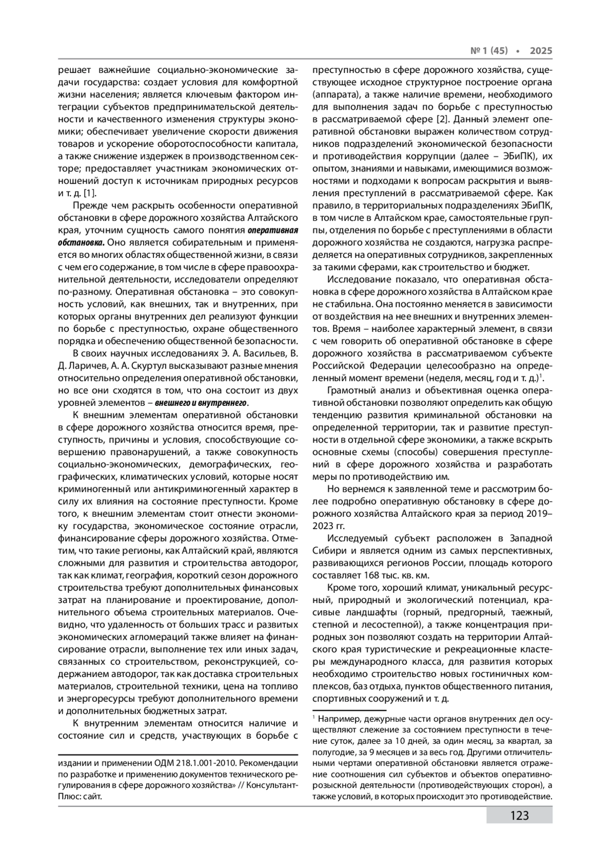 Прежде чем раскрыть особенности оперативной обстановки в сфере дорожного хозяйства Алтайского края, уточним сущность самого понятия оперативная обстановка. Оно является собирательным и применяется во многих областях общественной жизни, в связи с чем его содержание, в том числе в сфере правоохранительной деятельности, исследователи определяют по-разному. Оперативная обстановка – это совокупность условий, как внешних, так и внутренних, при которых органы внутренних дел реализуют функции по борьбе с преступностью, охране общественного порядка и обеспечению общественной безопасности. В своих научных исследованиях Э. А. Васильев, В. Д. Ларичев, А. А. Скуртул высказывают разные мнения относительно определения оперативной обстановки, но все они сходятся в том, что она состоит из двух уровней элементов – внешнего и внутреннего.