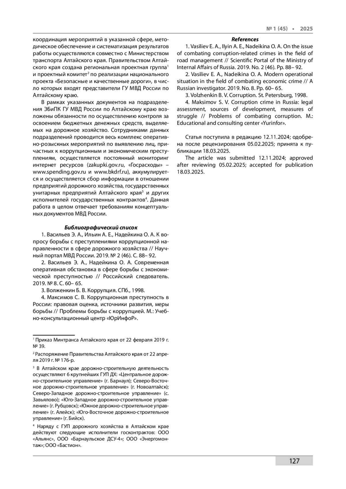 1. Васильев Э. А., Ильин А. Е., Надейкина О. А. К вопросу борьбы с преступлениями коррупционной направленности в сфере дорожного хозяйства // Научный портал МВД России. 2019. № 2 (46). С. 88- 92.