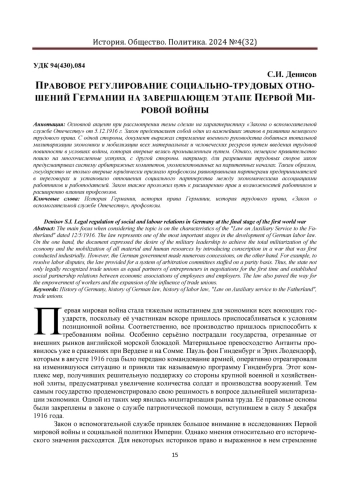 Основной акцент при рассмотрении темы сделан на характеристику «Закона о вспомогательной службе Отечеству» от 5.12.1916 г. Закон представляет собой один из важнейших этапов в развитии немецкого трудового права. С одной стороны, документ выражал стремление военного руководства добиться тотальной милитаризации экономики и мобилизации всех материальных и человеческих ресурсов путем введения трудовой повинности в условиях войны, которая впервые велась промышленным путем. Однако, немецкое правительство пошло на многочисленные уступки, с другой стороны. например, для разрешения трудовых споров закон предусматривал систему арбитражных комитетов, укомплектованных на паритетных началах. Таким образом, государство не только впервые юридически признало профсоюзы равноправными партнерами предпринимателей в переговорах и установило отношения социального партнерства между экономическими ассоциациями работников и работодателей. Закон также проложил путь к расширению прав и возможностей работников и расширению влияния профсоюзов.