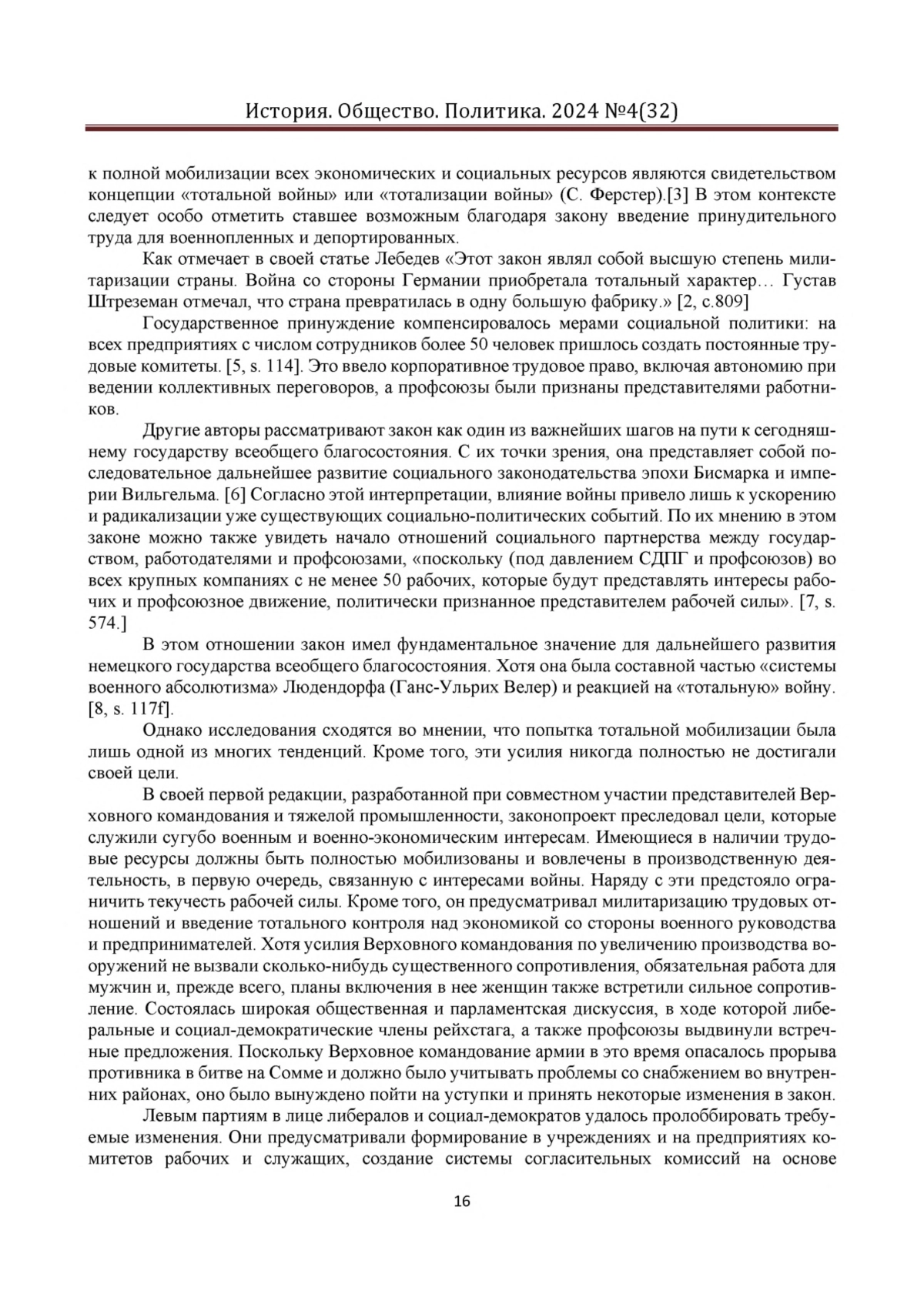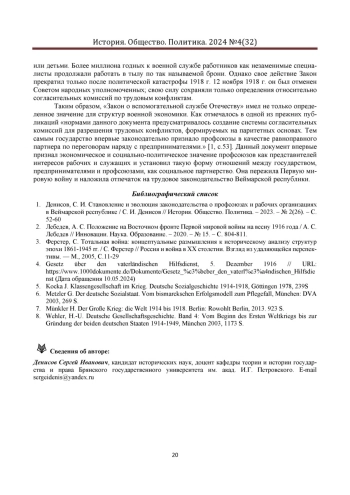1. Денисов, С. И. Становление и эволюция законодательства о профсоюзах и рабочих организациях в Веймарской республике / С. И. Денисов // История. Общество. Политика. - 2023. - № 2(26). - С. 52-60. EDN: PHWHFV