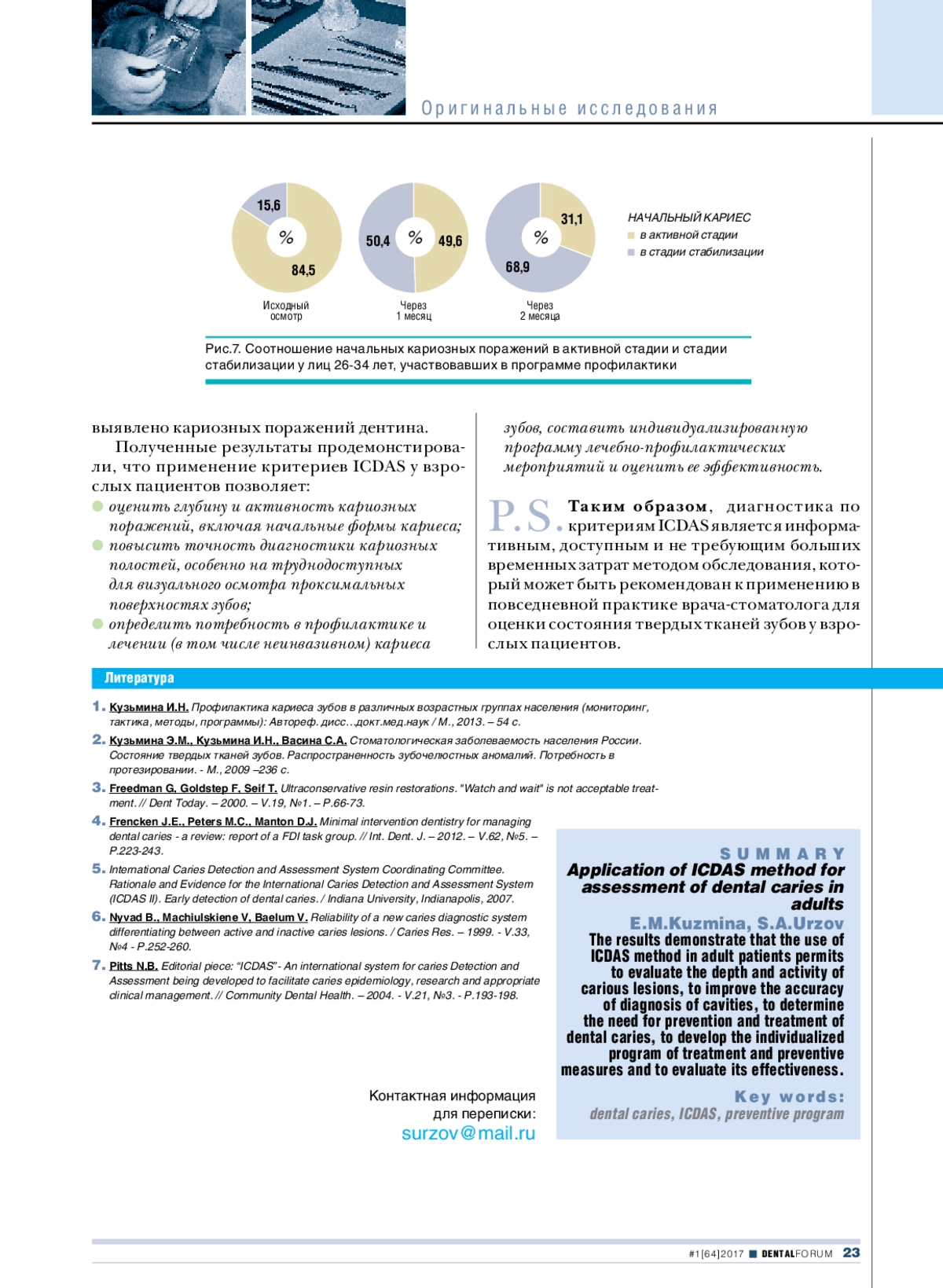 7. Pitts N.B. Editorial piece: “ICDAS’- An international system for caries Detection and Assessment being developed to facilitate caries epidemiology, research and appropriate clinical management. // Community Dental Health. - 2004. - V.21, №3. - P.193-198.