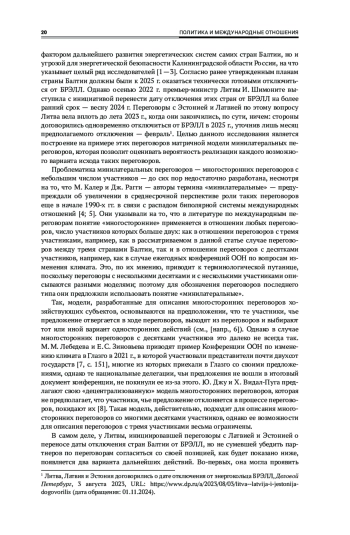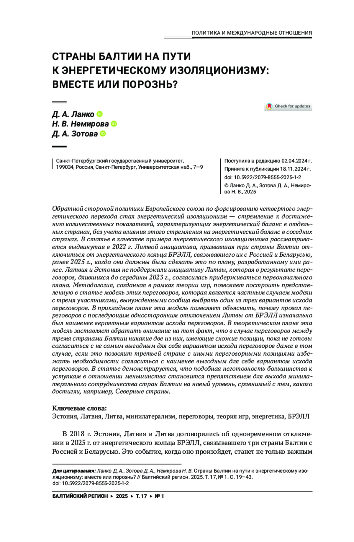 Обратной стороной политики Европейского союза по форсированию четвертого энергетического перехода стал энергетический изоляционизм - стремление к достижению количественных показателей, характеризующих энергетический баланс в отдельных странах, без учета влияния этого стремления на энергетический баланс в соседних странах. В статье в качестве примера энергетического изоляционизма рассматривается выдвинутая в 2022 г. Литвой инициатива, призвавшая три страны Балтии отключиться от энергетического кольца БРЭЛЛ, связывавшего их с Россией и Беларусью, ранее 2025 г., когда они должны были сделать это по плану, разработанному ими ранее. Латвия и Эстония не поддержали инициативу Литвы, которая в результате переговоров, длившихся до середины 2023 г., согласилась придерживаться первоначального плана. Методология, созданная в рамках теории игр, позволяет построить представленную в статье модель этих переговоров, которая является частным случаем модели с тремя участниками, вынужденными сообща выбрать один из трех вариантов исхода переговоров. В прикладном плане эта модель позволяет объяснить, почему провал переговоров с последующим односторонним отключением Литвы от БРЭЛЛ изначально был наименее вероятным вариантом исхода переговоров. В теоретическом плане эта модель заставляет обратить внимание на тот факт, что в случае переговоров между тремя странами Балтии никакие две из них, имеющие схожие позиции, пока не готовы согласиться с не самым выгодным для себя вариантом исхода переговоров даже в том случае, если это позволит третьей стране с иными переговорными позициями избежать необходимости согласиться с наименее выгодным для себя вариантом исхода переговоров. В статье демонстрируется, что подобная неготовность большинства к уступкам в отношении меньшинства становится препятствием для выхода минилатерального сотрудничества стран Балтии на новый уровень, сравнимый с тем, какого достигли, например, Северные страны.