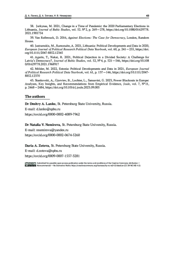 38. Jurkynas, M. 2021, Change in a Time of Pandemic: the 2020 Parliamentary Elections in Lithuania, Journal of Baltic Studies, vol. 52, № 2, p. 269-278,. DOI: 10.1080/01629778.2021.1901754 EDN: MOCQZL