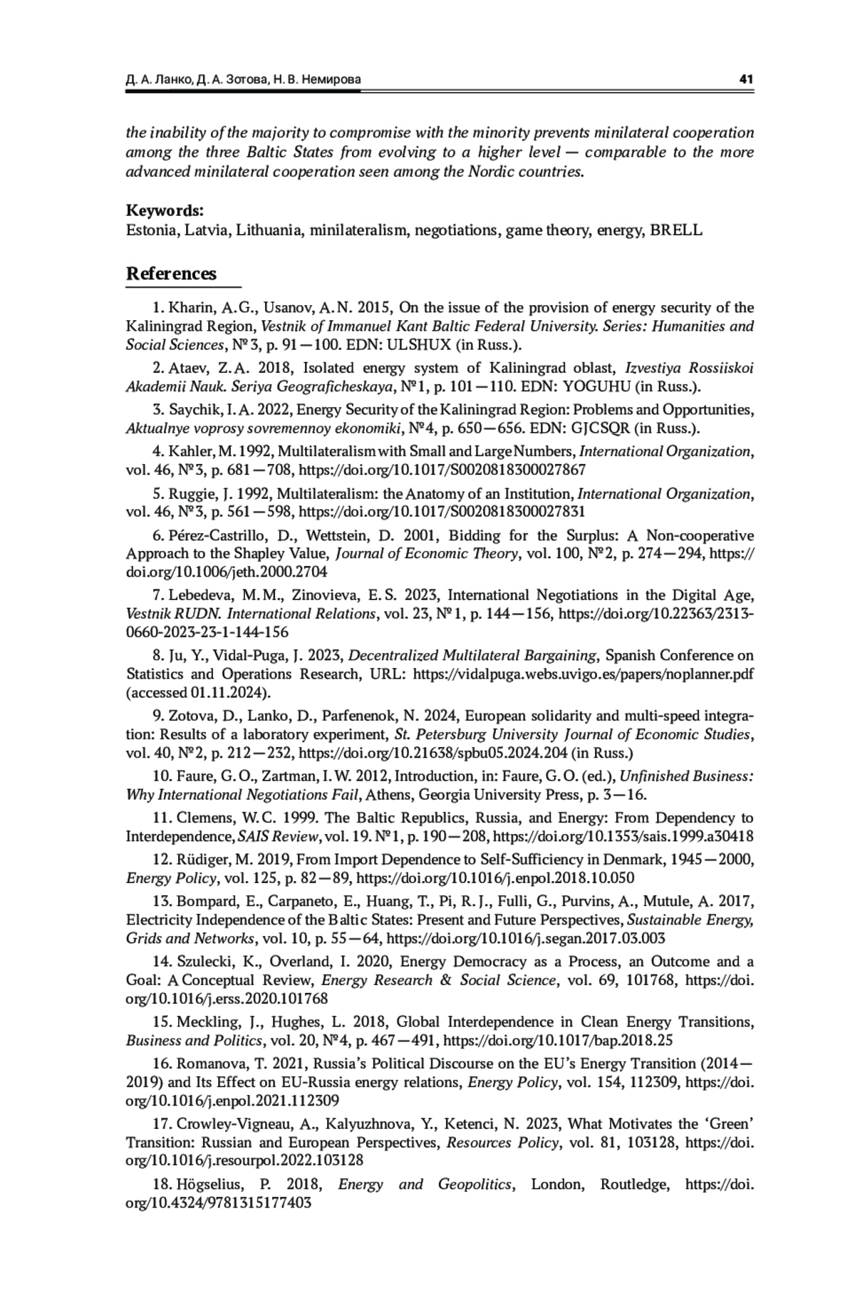 34. Lanko, D. 2022, Modelling Negotiations on the Nordic Economic Area: Uncertainty and Absolute Gains as Factors of International Solidarity, Vestnik of Saint Petersburg University. International Relations, vol. 15, № 3, p. 243-261,. DOI: 10.21638/spbu06.2022.302