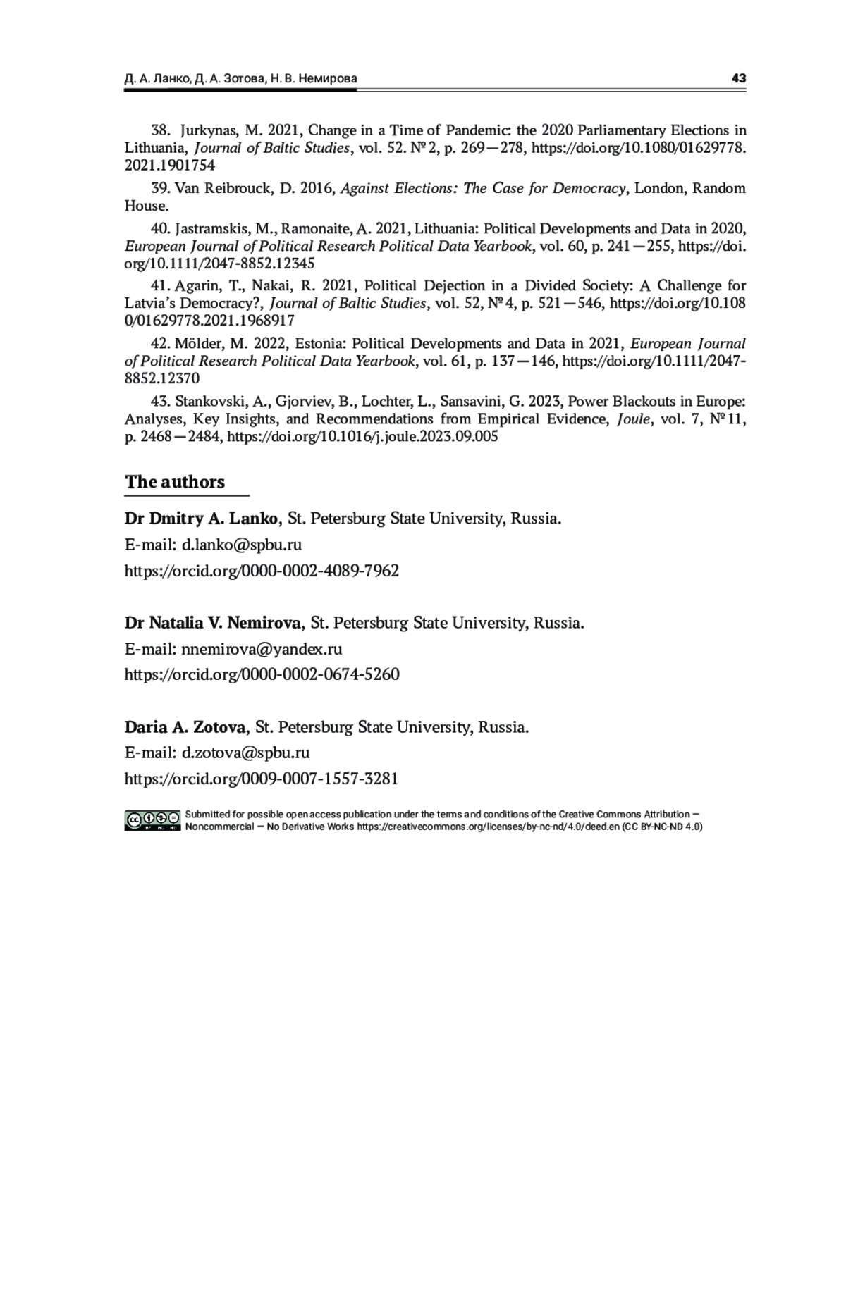 41. Agarin, T., Nakai, R. 2021, Political Dejection in a Divided Society: A Challenge for Latvia’s Democracy?, Journal of Baltic Studies, vol. 52, № 4, p. 521-546,. DOI: 10.1080/01629778.2021.1968917 EDN: ZALOZY