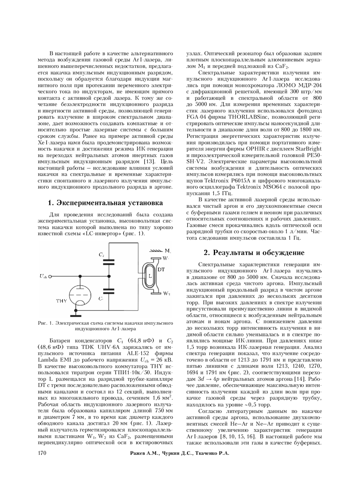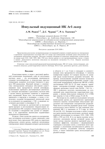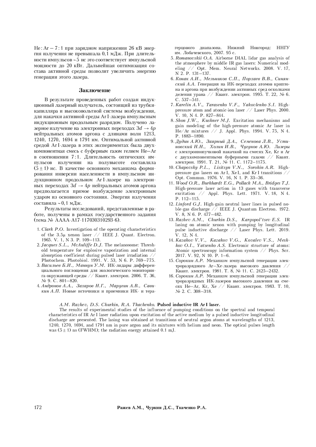13. Razhev A.M., Churkin D.S., Kargopol’tsev E.S. IR lasing on atomic xenon with pumping by longitudinal pulse inductive discharge // Laser Phys. Lett. 2019. V. 12, N 4. EDN: WUSEDU