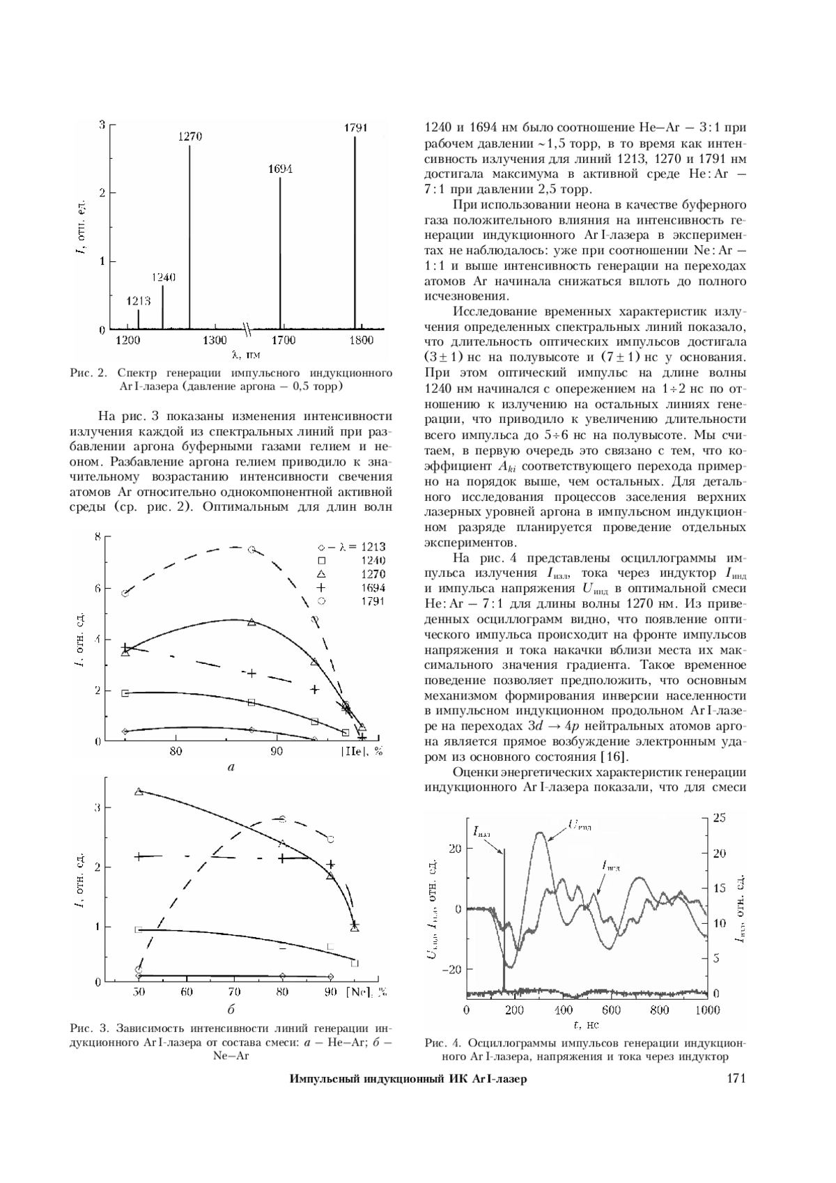 Представлены результаты экспериментальных исследований влияния условий накачки на спектральные и временные характеристики излучения ИК Ar I-лазера при возбуждении активной среды импульсным индукционным продольным разрядом. Получена лазерная генерация на переходах нейтральных атомов аргона на длинах волн 1213, 1240, 1270, 1694, 1791 нм в чистом аргоне и в его двухкомпонентных смесях с гелием и неоном. Длительность оптических импульсов на полувысоте составляла (5 ± 1) нс. Энергия излучения достигала 0,1 мДж.