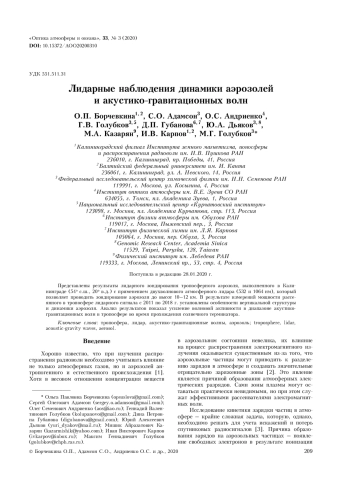 Представлены результаты лидарного зондирования тропосферного аэрозоля, выполненного в Калининграде (54° с. ш., 20° в. д.) с применением двухволнового атмосферного лидара (532 и 1064 нм), который позволяет проводить зондирование аэрозоля до высот 10-12 км. В результате измерений мощности рассеянного в тропосфере лидарного сигнала с 2011 по 2018 г. установлены особенности вертикальной структуры и динамики аэрозоля. Анализ результатов показал усиление волновой активности в диапазоне акустико-гравитационных волн в тропосфере во время прохождения солнечного терминатора.