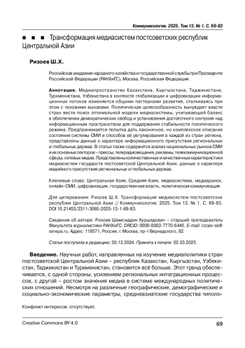 Медиапространство Казахстана, Кыргызстана, Таджикистана, Туркменистана, Узбекистана в контексте глобализации и цифровизации информационных потоков изменяется общими паттернами развития, сталкиваясь при этом с похожими вызовами. Политическая целесообразность вынуждает власти стран вести поиск оптимальной модели медиасистемы, учитывающей баланс в обеспечении демократических свобод и установления достаточного контроля над информационным пространством для поддержания стабильности политического режима. Предпринимается попытка дать лаконичное, но комплексное описание состояния системы СМИ и способов её регулирования в каждой из стран региона, представлены данные о характере информационного присутствия региональных и глобальных держав. В статье также содержится анализ национальных рынков СМИ и их основных секторов – прессы, телерадиовещания, рекламы, телекоммуникационной сферы, сетевых медиа. Представлены количественные и качественные характеристики медиасистем государств постсоветской Центральной Азии, данные о характере медийного присутствия региональных и глобальных держав.
