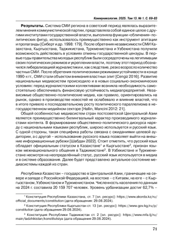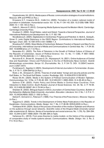 10. Салимов Д.М. (2023). Публичная политика и сетевые СМИ в среднеазиатских странах: от взаимодействия до государственного контроля // Южно-российский журнал социальных наук. Т. 24. № 2. С. 78-94. https://doi.org/10.31429/26190567-24-2-78-94.
