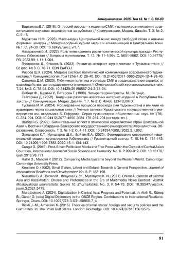 13. Тухтаева М.М. (2024). Исследование процесса перехода сми Таджикистана и влияния на аудиторию через социальные сети // Ученые записки Худжандского государственного университета им. академика Б. Гафурова. Серия гуманитарно-общественных наук. №1(78). С. 284-294. https://doi.org/10.24412/2077-4990-2024-178-284-294 (на тадж. яз.).