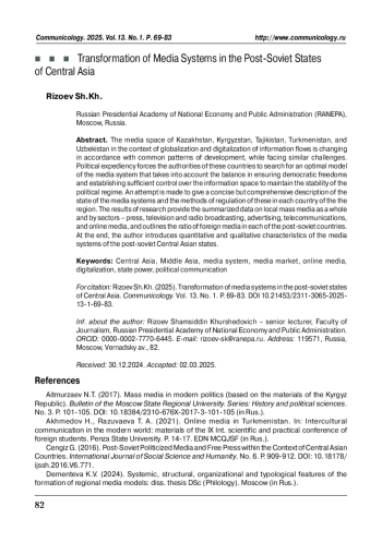 16. Cengiz G. (2016). Post-Soviet Politicized Media and Free Press within the Context of Central Asian Countries. International Journal of Social Science and Humanity. No. 6. P. 909-912. https://doi.org/10.18178/ijssh.2016.V6.771.