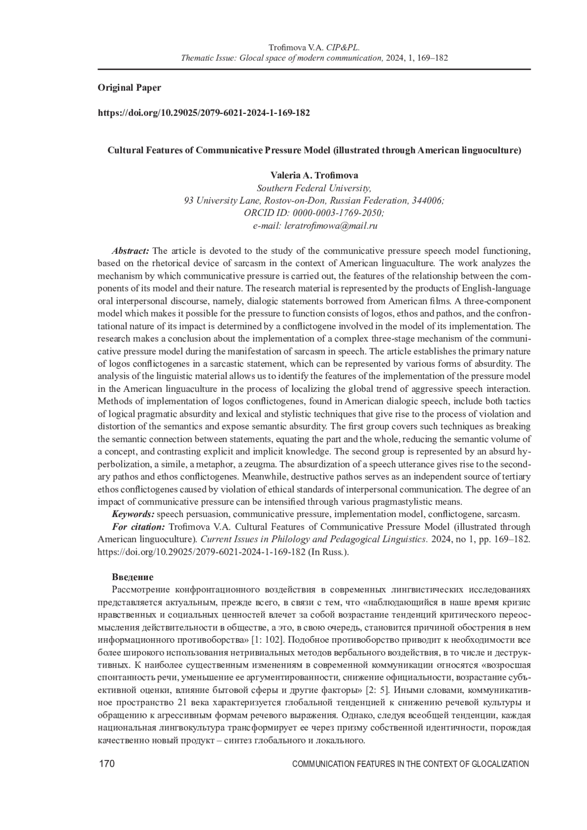 Статья посвящена изучению специфики функционирования речевой модели коммуникативного давления, основанного на риторическом приёме сарказм, в контексте американской лингвокультуры. В работе анализируется механизм, посредством которого осуществляется коммуникативное давление, особенности взаимосвязи компонентов его модели и их характер. Материалом исследования послужили продукты англоязычного устного межличностного дискурса, а именно, диалогические высказывания, заимствованные из американских кинофильмов. Функционирование давления обеспечивается трехкомпонентной моделью, состоящей из логоса, этоса и пафоса, а конфронтационный характер его воздействия обусловливается наличием конфликтогена в модели его реализации. Делается вывод о реализации сложного трехступенчатого механизма модели коммуникативного давления при манифестации сарказма в речи. В статье устанавливается первичный характер конфликтогенов логоса в саркастическом высказывании, источником порождения которых выступают различные формы абсурда. Анализ языкового материала позволяет выявить особенности реализации модели давления в американской лингвокультуре, приобретенные в процессе локализации глобальной тенденции агрессивной речевой интеракции. Способы объективации конфликтогенов логоса, обнаруженные в американской диалогической речи, включают в себя как тактики логического прагматического абсурда, так и лексико-стилистические приемы, порождающие процесс нарушения и искажения семантического плана и эксплицирующие семантический абсурд. Первая группа охватывает такие приемы, как нарушение смысловой связи между высказываниями, приравнивание части и целого, сокращения смыслового объема понятия, противопоставление эксплицитного и имплицитного знания. Вторая группа представлена абсурдной гиперболизацией, сравнением, метафорой, зевгмой. Абсурдизация речевого высказывания обусловливает появление конфликтогенов пафоса и этоса в статусе вторичных. В то же время деструктивный пафос выступает самостоятельным источником третичных конфликтогенов этоса как следствие нарушения этических стандартов межличностной коммуникации. Степень воздействия коммуникативного давления может интенсифицироваться при помощи различных прагмастилистических средств.