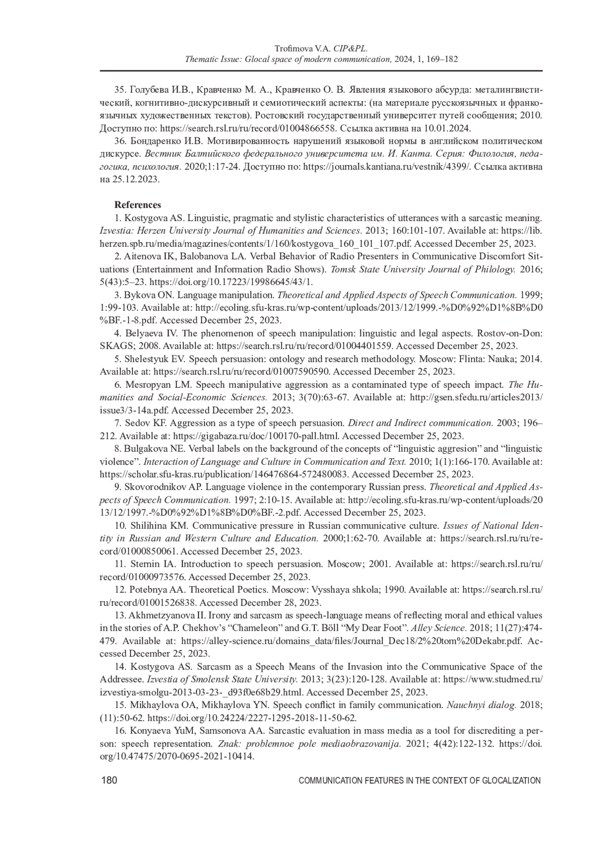 16. Коняева Ю.М., Самсонова А.А. Саркастическая оценка в массмедиа как инструмент дискредитации личности: речевая репрезентация. Знак: проблемное поле медиаобразования. 2021;4(42):122-132. DOI: 10.47475/2070-0695-2021-10414 EDN: TFCTQP