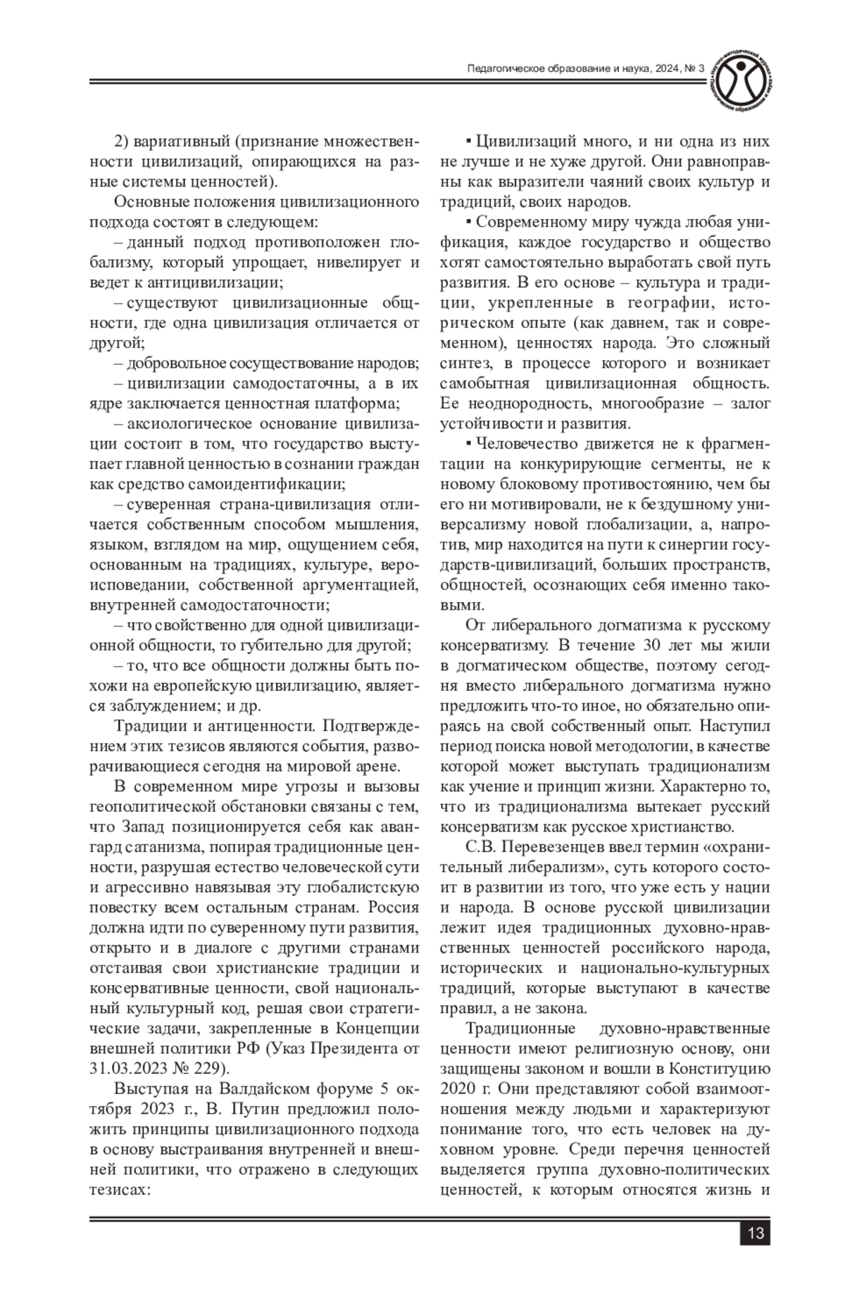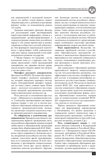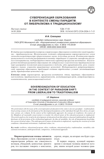 В статье рассматриваются вопросы суверенизации образования в контексте новой парадигмы - традиционализма. Целеполагание состоит в формировании мировоззренческих основ личности посредством трех форм познания: науки, искусства, религии. В контексте традиционалистского подхода раскрываются понятие «традиция» и сущность манифеста разумного консерватизма, подчеркивается этический характер программы воспитания. Анализируется тенденция развития образования от либерализма к классическому традиционализму через раскрытие положений цивилизационного подхода, идеи вариативности, роли гуманитарного знания, сущности нравственных ценностей. Подчеркивается антропоцентрический характер образования, требующий создания определенных условий (воспитывающая среда, традиционные ценности и др.).