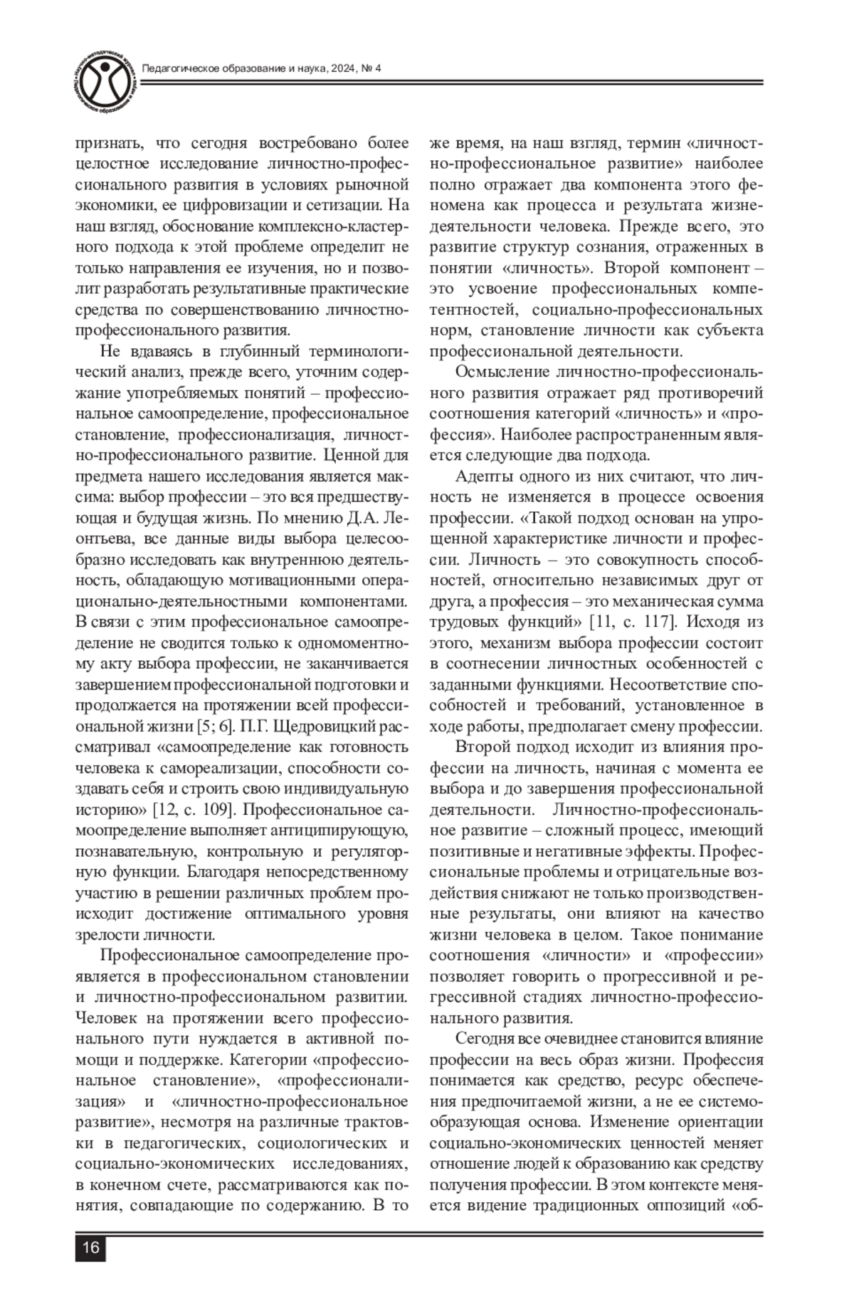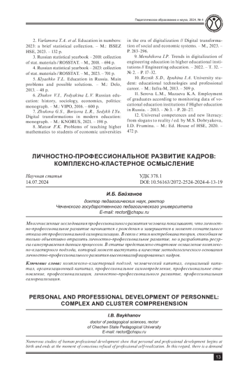 Многочисленные исследования профессионального развития человека показывают, что личностно-профессиональное развитие начинается с рождения и завершается в момент сознательного отказа от профессиональной самореализации. В связи с этим востребована теория, способная не только объективно отразить личностно-профессиональное развитие, но и разработать ресурсы самоуправления данным процессом. В статье представлено стартовое осмысление комплексно-кластерного подхода, который может выступить в качестве методологического основания личностно-профессионального развития высококвалифицированных кадров.
