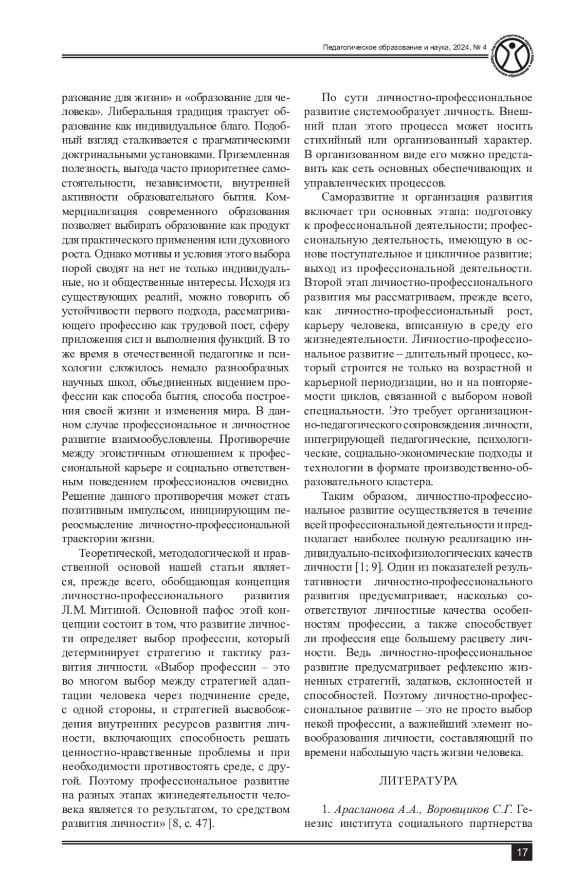 1. Арасланова А.А., Воровщиков С.Г. Генезис института социального партнерства как идеологии и технологии согласования взаимовыгодного взаимодействия // Педагогическое образование и наука. - 2020. -№ 1. - С. 17-22. EDN: ELTXLR