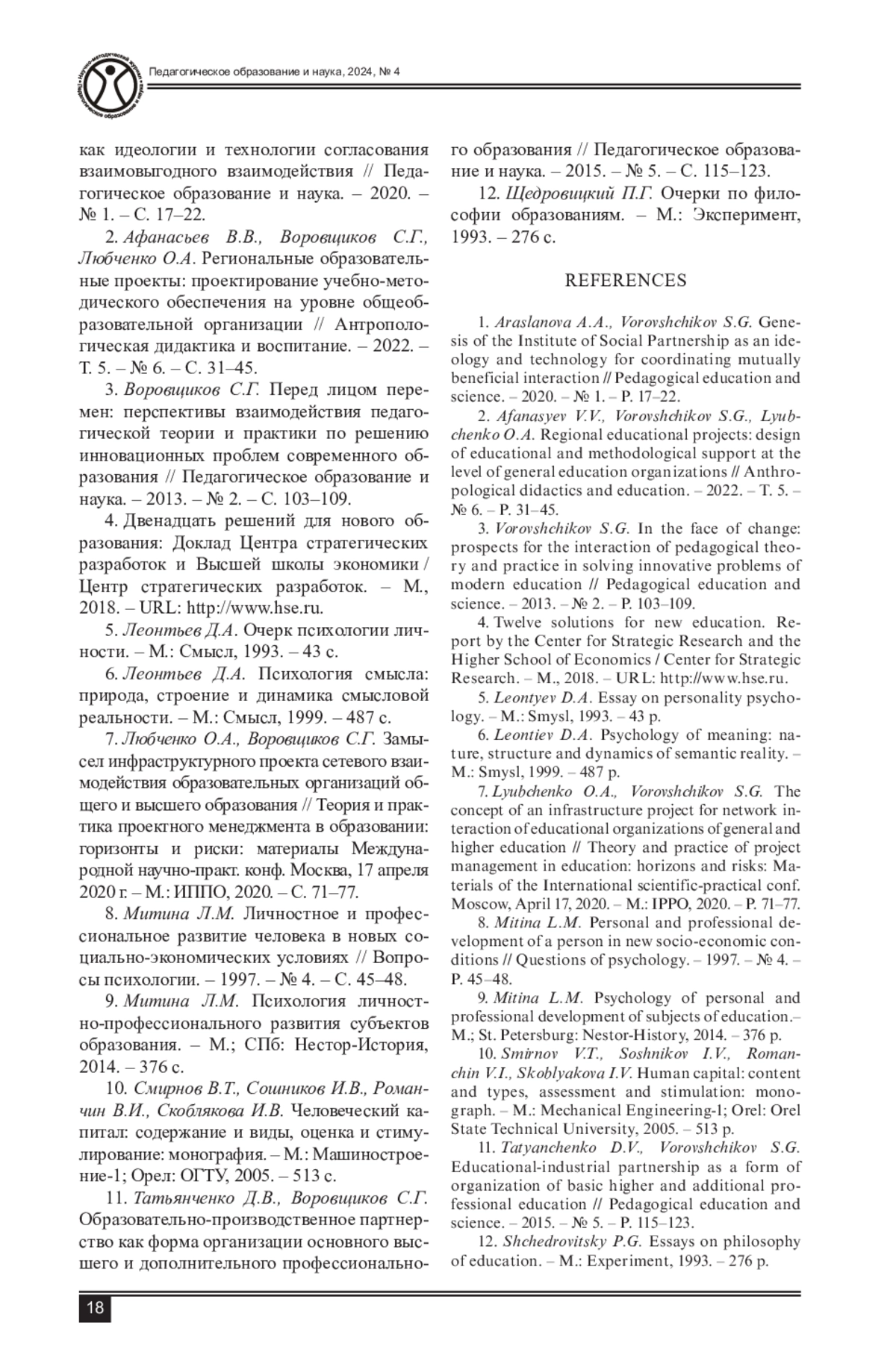 11. Татьянченко Д.В., Воровщиков С.Г. Образовательно-производственное партнерство как форма организации основного высшего и дополнительного профессионального образования // Педагогическое образование и наука. - 2015. - № 5. - С. 115-123. EDN: VPMHNL