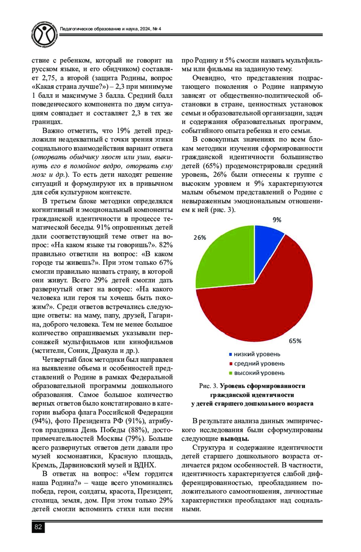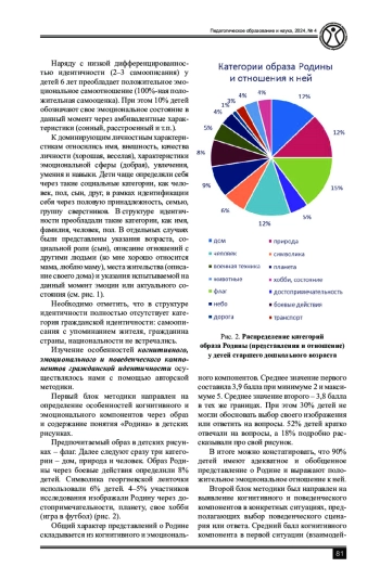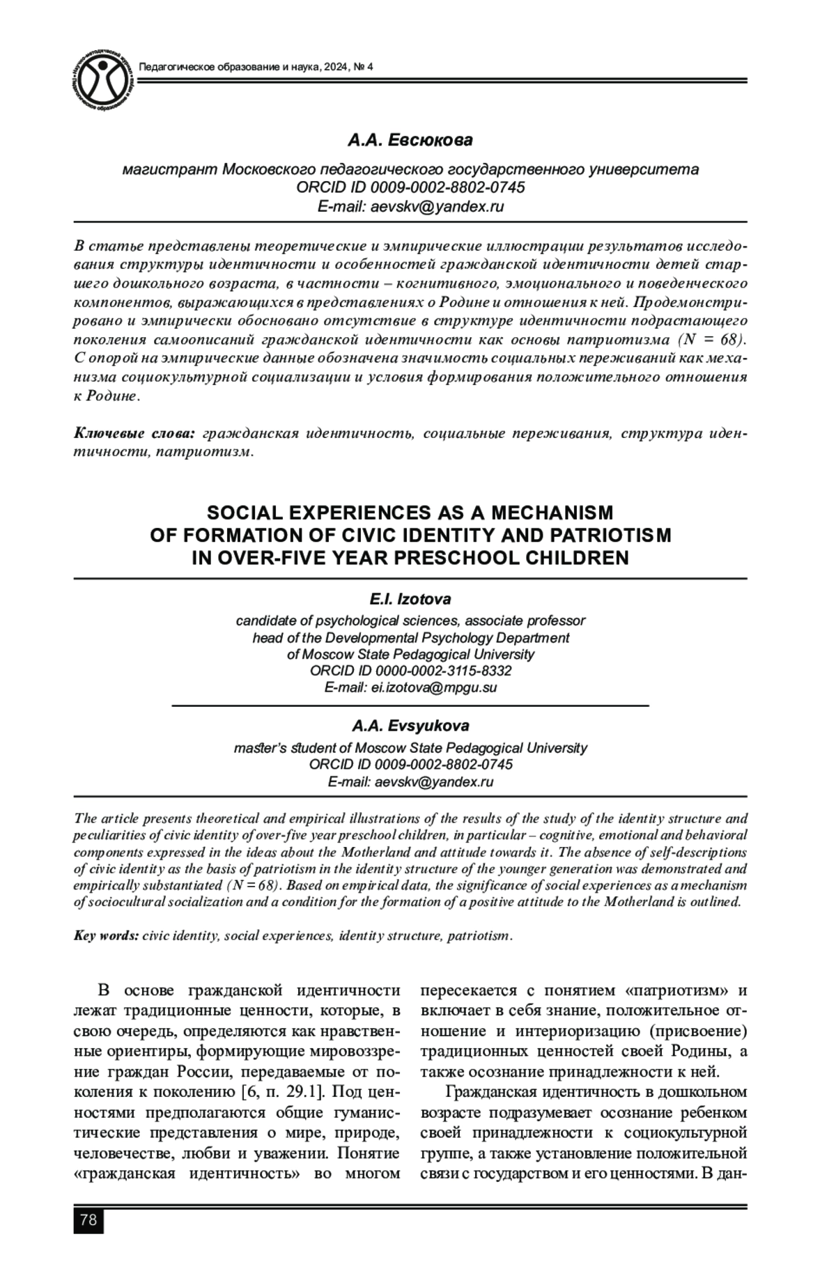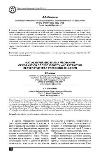 В статье представлены теоретические и эмпирические иллюстрации результатов исследования структуры идентичности и особенностей гражданской идентичности детей старшего дошкольного возраста, в частности - когнитивного, эмоционального и поведенческого компонентов, выражающихся в представлениях о Родине и отношения к ней. Продемонстрировано и эмпирически обосновано отсутствие в структуре идентичности подрастающего поколения самоописаний гражданской идентичности как основы патриотизма (N = 68). С опорой на эмпирические данные обозначена значимость социальных переживаний как механизма социокультурной социализации и условия формирования положительного отношения к Родине.