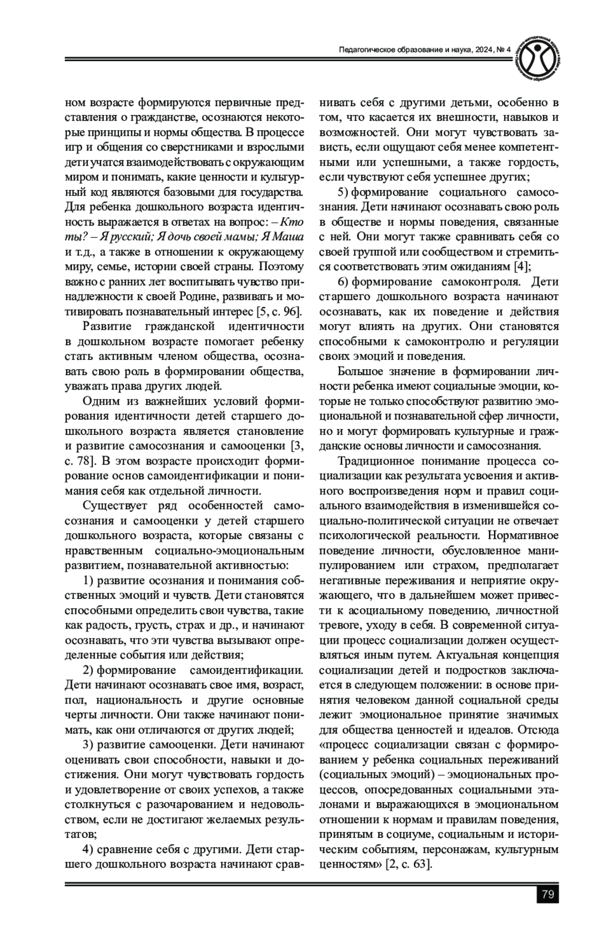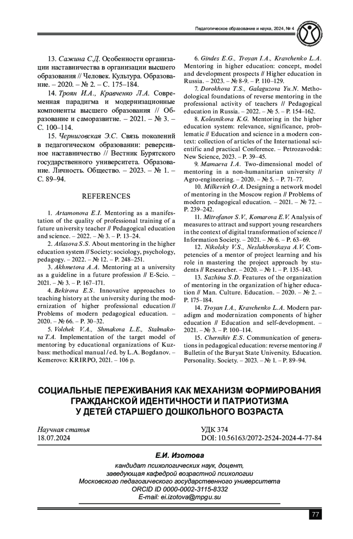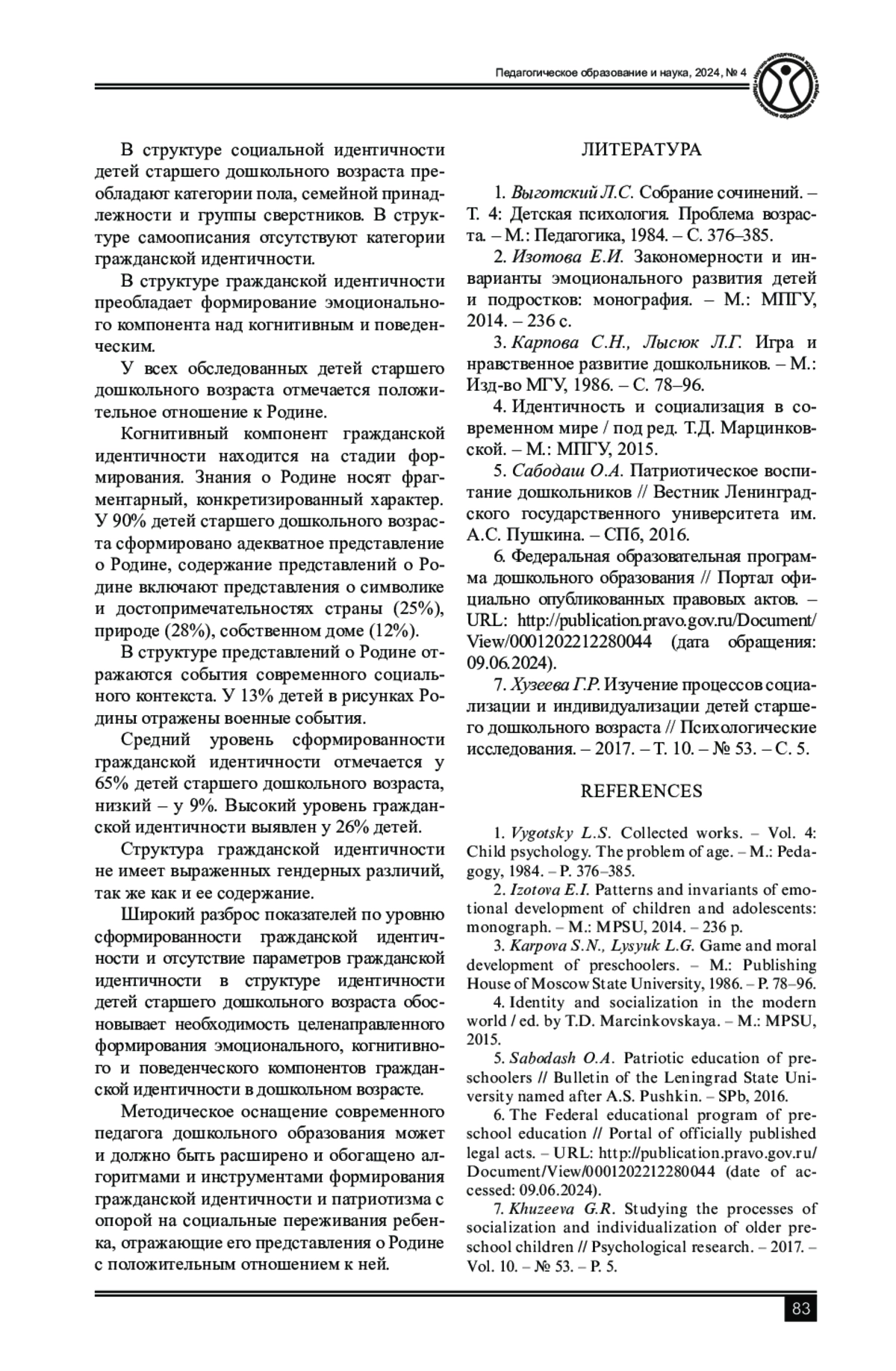 7. Хузеева Г.Р. Изучение процессов социализации и индивидуализации детей старшего дошкольного возраста // Психологические исследования. - 2017. - Т. 10. - № 53. - С. 5.