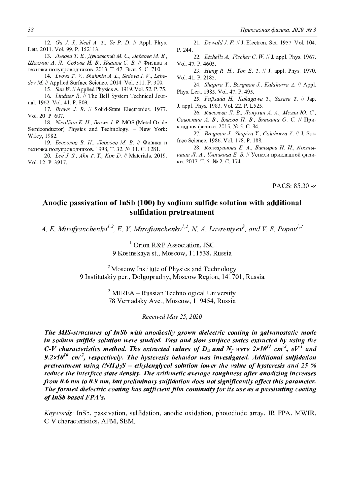 Мирофянченко А. Е., Мирофянченко Е. В., Лаврентьев Н. А., Попов В. С. Пассивация фоточувствительных элементов InSb (100) анодным окислением в растворе сульфида натрия с предварительным сульфидированием поверхности 33