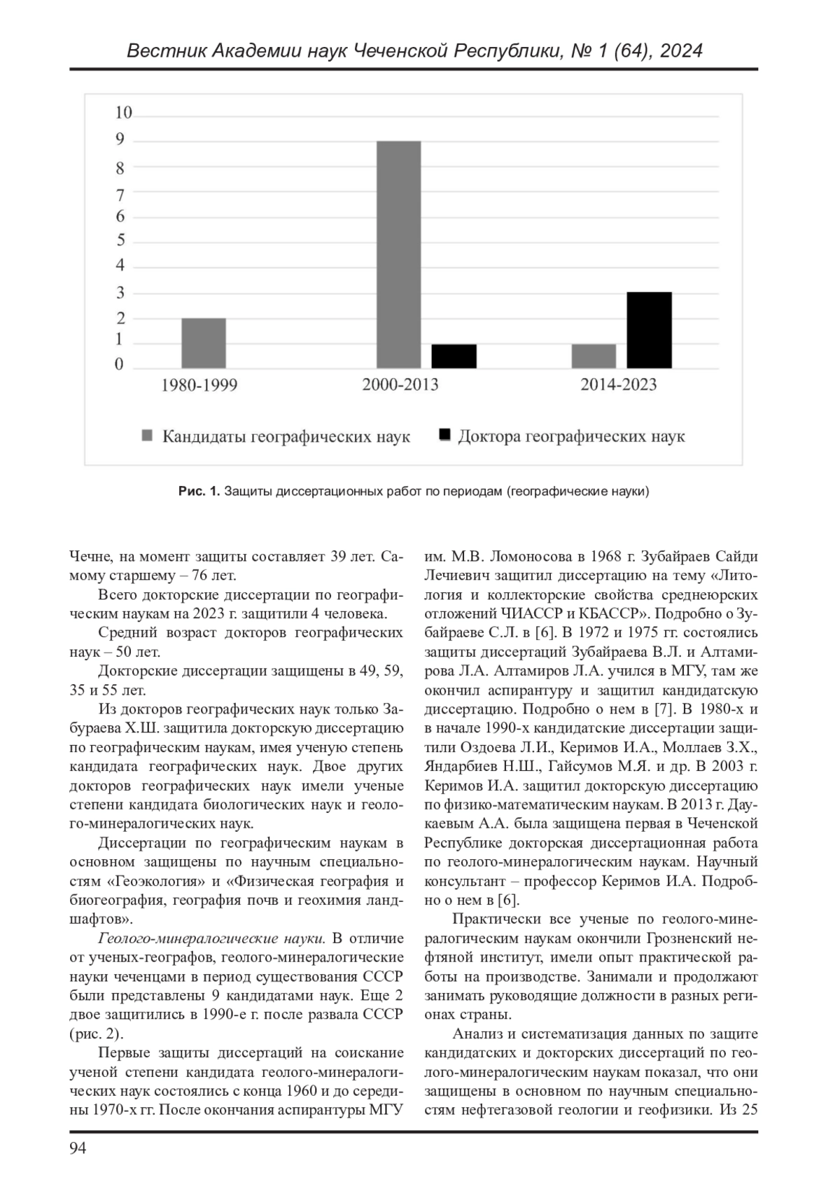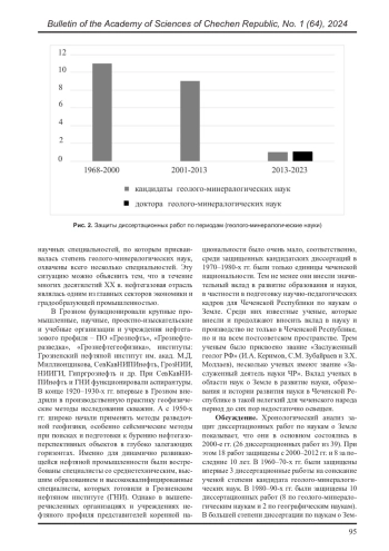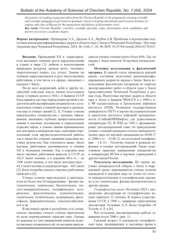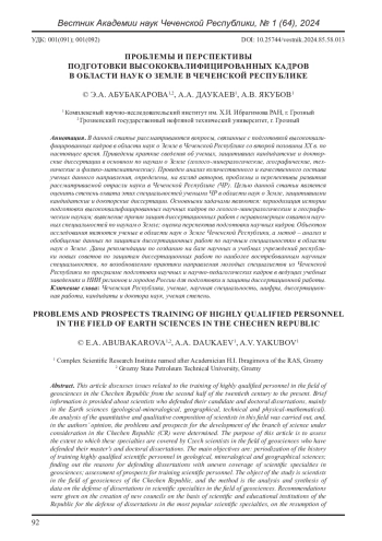 В данной статье рассматриваются вопросы, связанные с подготовкой высококвалифицированных кадров в области наук о Земле в Чеченской Республике со второй половины ХХ в. по настоящее время. Приведены краткие сведения об ученых, защитивших кандидатские и докторские диссертации в основном по наукам о Земле (геолого-минералогические, географические, технические и физико-математические). Проведен анализ количественного и качественного состава ученых данного направления, определены, на взгляд авторов, проблемы и перспективы развития рассматриваемой отрасли науки в Чеченской Республике (ЧР). Целью данной статьи является оценить степень охвата этих специальностей учеными ЧР в области наук о Земле, защитившими кандидатские и докторские диссертации. Основными задачами являются: периодизация истории подготовки высококвалифицированных научных кадров по геолого-минералогическим и географическим наукам; выяснение причин защит диссертационных работ с неравномерным охватом научных специальностей по наукам о Земле; оценка перспектив подготовки научных кадров. Объектом исследования являются ученые в области наук о Земле Чеченской Республики, а метод - анализ и обобщение данных по защитам диссертационных работ по научным специальностям в области наук о Земле. Даны рекомендации по созданию на базе научных и учебных учреждений республики новых советов по защитам диссертационных работ по наиболее востребованным научным специальностям, по возобновлению практики направления молодых специалистов из Чеченской Республики по программе подготовки научных и научно-педагогических кадров в ведущих учебных заведениях и НИИ регионов и городов России для подготовки и защиты диссертационной работы.