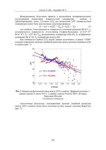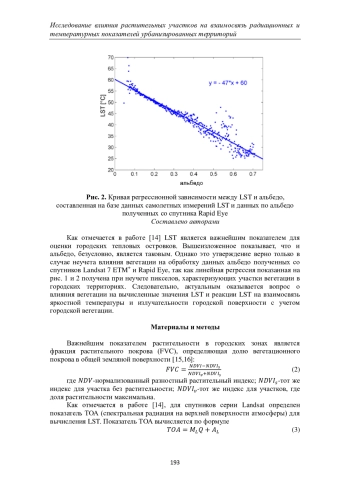 Как отмечается в работе [14] LST является важнейшим показателем для оценки городских тепловых островков. Вышеизложенное показывает, что и альбедо, безусловно, является таковым. Однако это утверждение верно только в случае неучета влияния вегетации на обработку данных альбедо полученных со спутников Landsat 7 ETM+ и Rapid Eye, так как линейная регрессия показанная на рис. 1 и 2 получена при неучете пикселов, характеризующих участки вегетации в городских территориях. Следовательно, актуальным оказывается вопрос о влияния вегетации на вычисленные значения LST и реакции LST на взаимосвязь яркостной температуры и излучательности городской поверхности с учетом городской вегетации.