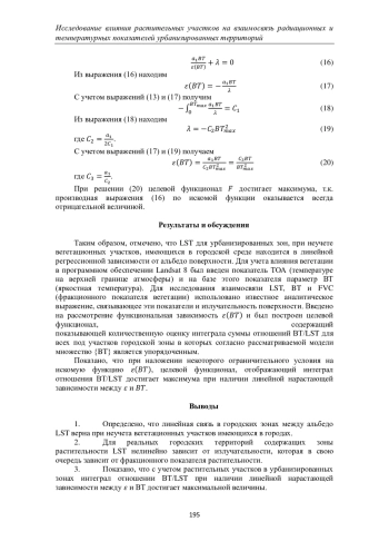 В статье исследуется вопрос о влияния вегетации на вычисленные значения LST и реакции LST на взаимосвязь яркостной температуры и излучательности городской поверхности с учетом городской вегетации. Показано, что линейная связь в городских зонах между альбедо LST верна при неучете вегетационных участков имеющихся в городах. Для реальных урбанизированных территорий, содержащих зоны растительности, LST нелинейно зависит от излучательности, которая в свою очередь зависит от фракционного показателя растительности. Определено, что с учетом растительных участков в урбанизированных зонах интеграл отношении ВТ/LST при наличии линейной нарастающей зависимости между и ВТ достигает максимальной величины.