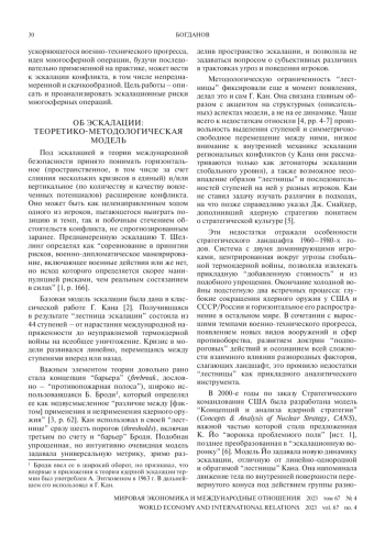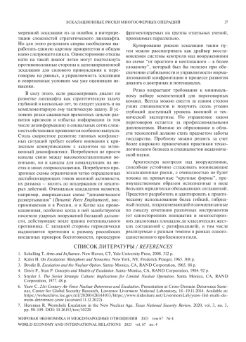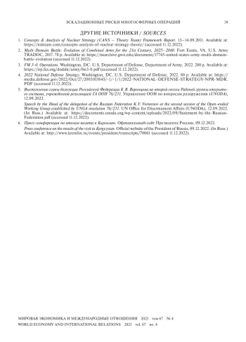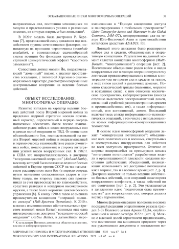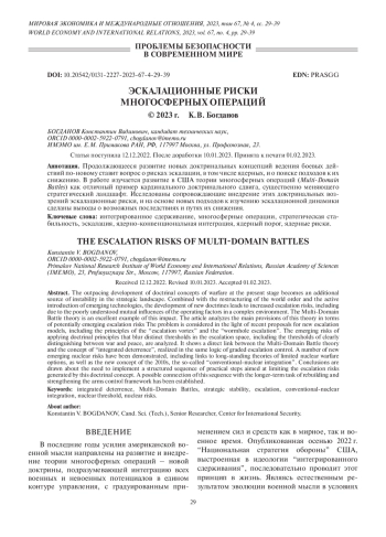 Продолжающееся развитие новых доктринальных концепций ведения боевых действий по-новому ставит вопрос о рисках эскалации, в том числе ядерных, и о поиске подходов к их снижению. В работе изучается развитие в США теории многосферных операций (Multi-DomainBattles) как отличный пример кардинального доктринального сдвига, существенно меняющего стратегический ландшафт. Исследованы сопровождающие внедрение этих доктринальных воззрений эскалационные риски и на основе новых подходов к изучению эскалационной динамики сделаны выводы о возможных последствиях и путях их снижения.